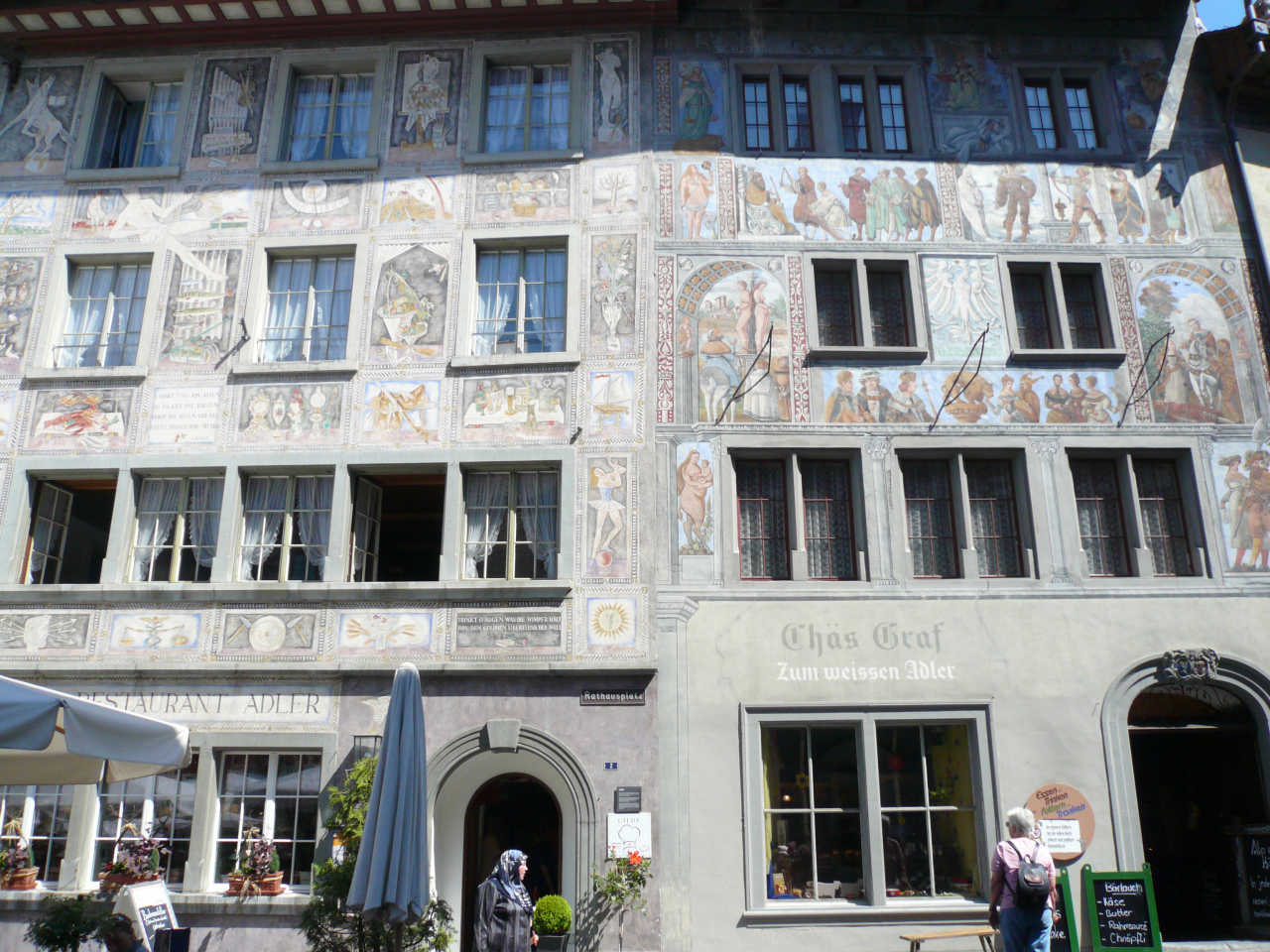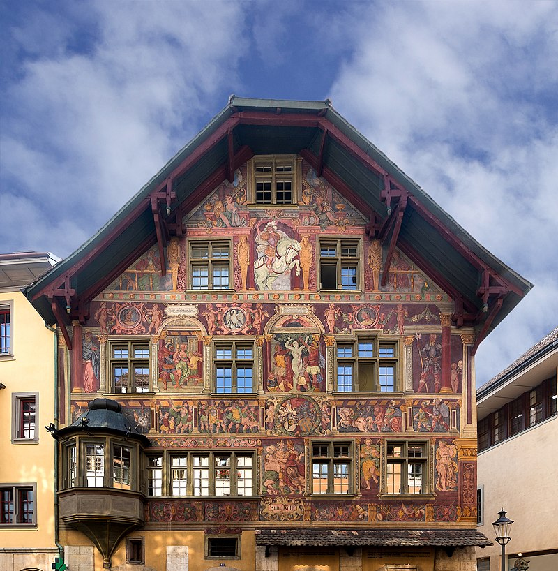 旧市街のVorstadtフォルシュタットにあるHaus zum Goldenen Ochsen金の雄牛の家が特に有名である。これは1492年創建の市民の家だが、黄金の牛やバビロン人を描いたフレスコ画が、赤い地の壁に見ることができる。