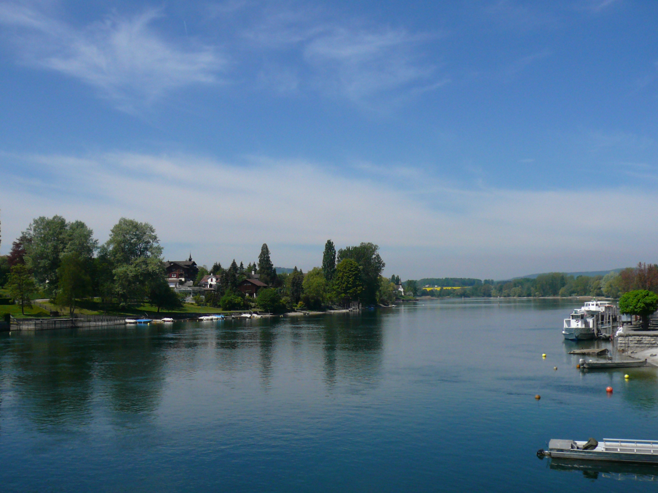 ライン川にそったプロムナードを歩く。Obertor上の門を過ぎ、洒落た家を見ながら、観光船が停泊している所に着いた。遠くに大蛇行を見る展望台の山が見え、チェアリフトのようなものも目に入った。気分は良いが青梅公園まで、結構歩いた。