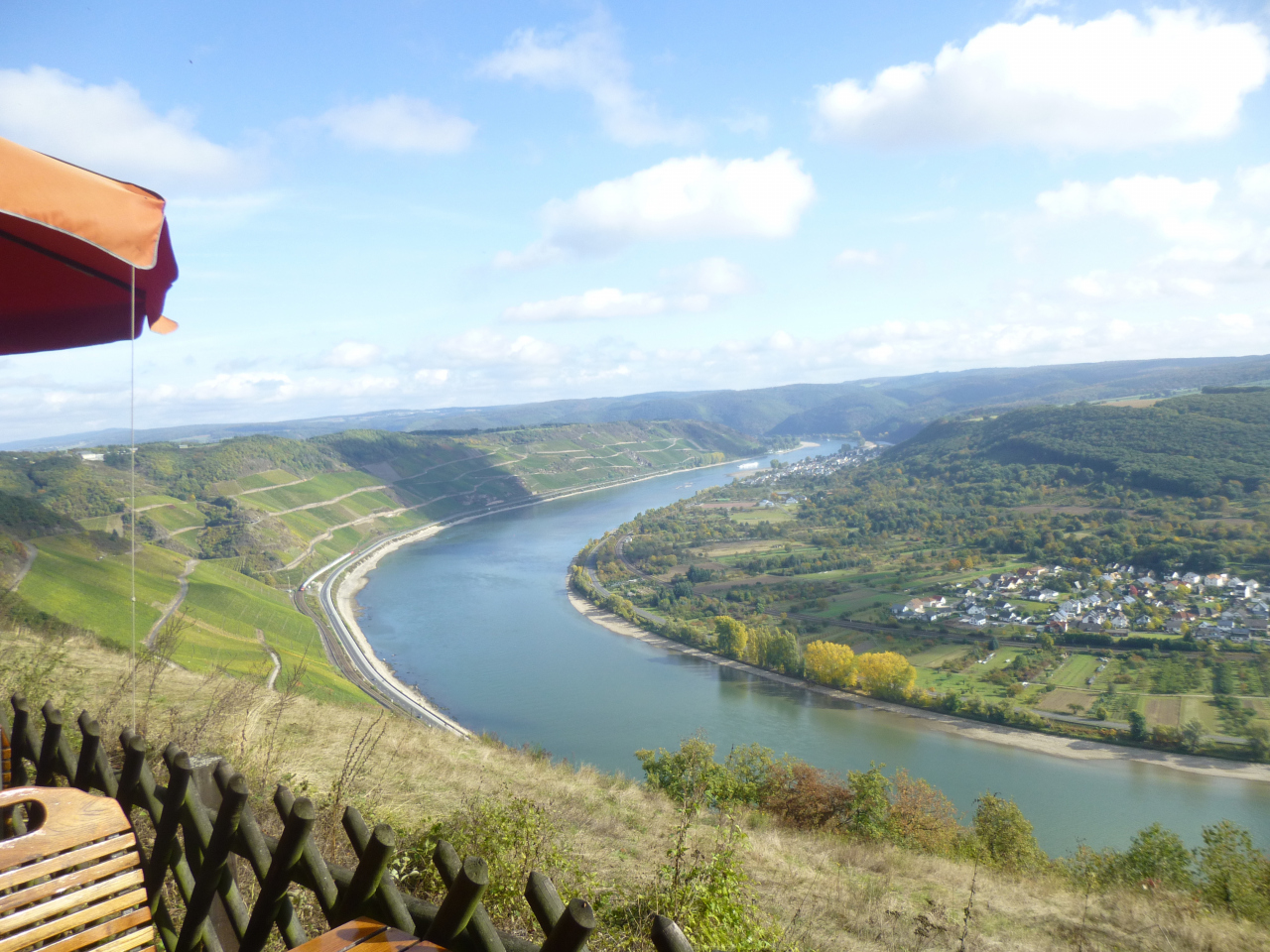 この展望台から見る対岸にも葡萄畑が広がり、半円形にライン川に囲まれたFilsenフィルゼン一帯の景観が実に美しい。