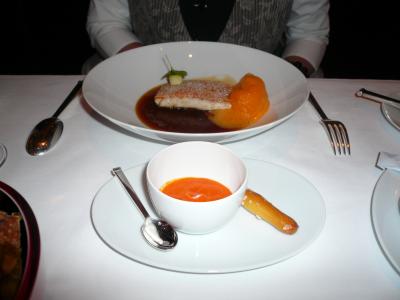 家内は赤ニゴイのロースト、ルイユソース(ジャガイモ、にんにく、赤唐辛子、オリーブオイル)と、ヴァニラ・サフランソースで。
