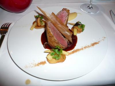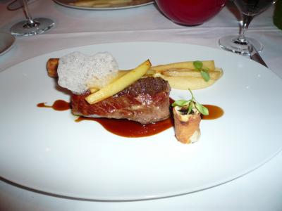 家内はHof Mueritzミューリッツ(メクレンブルク湖水地方の中心部にあり、良品で知られている。)産の子羊のうなじ肉、干しプラム、パースニップ(セリ科) 添え、ブラウンソース。