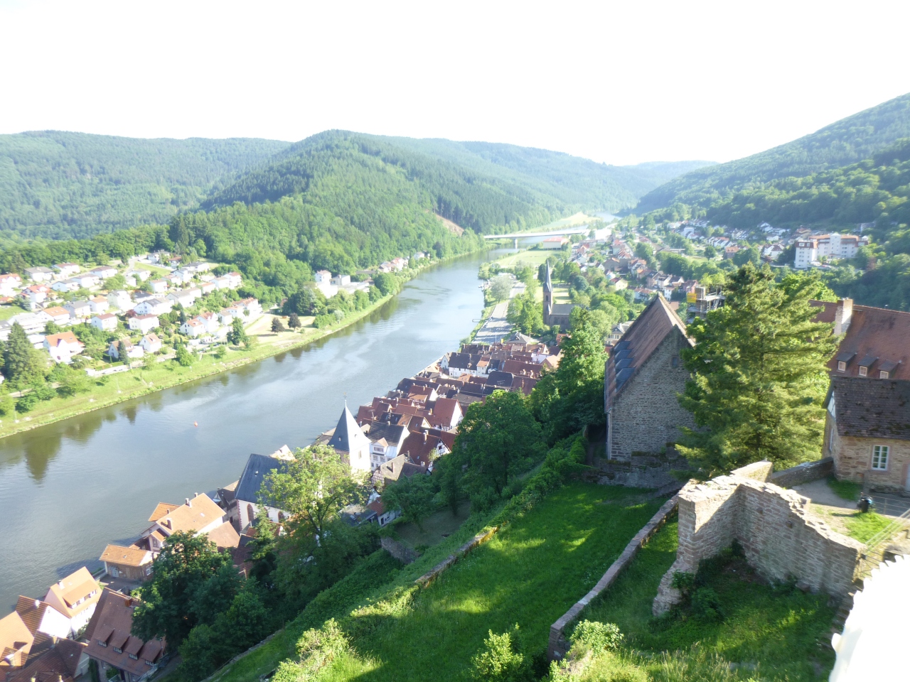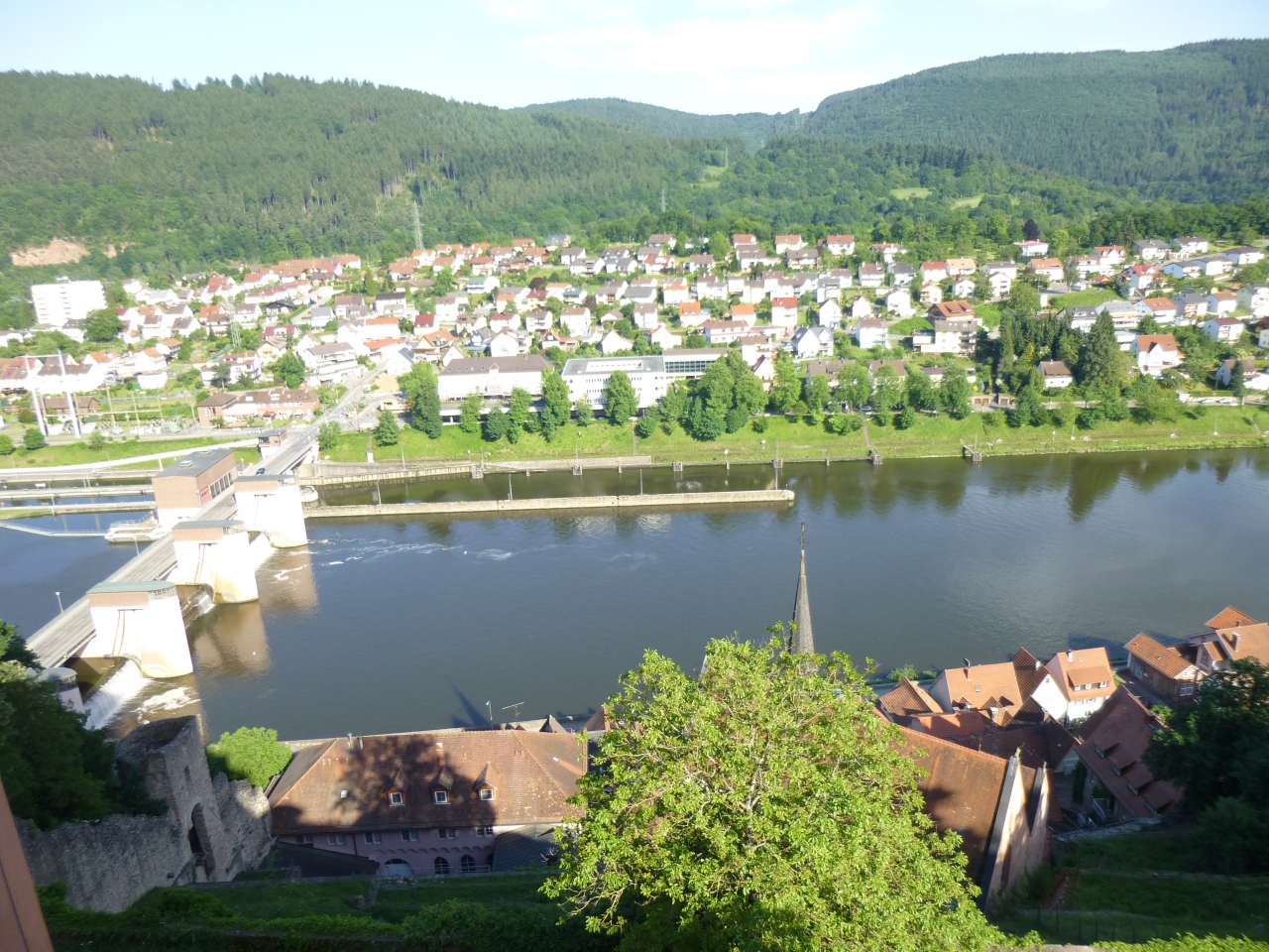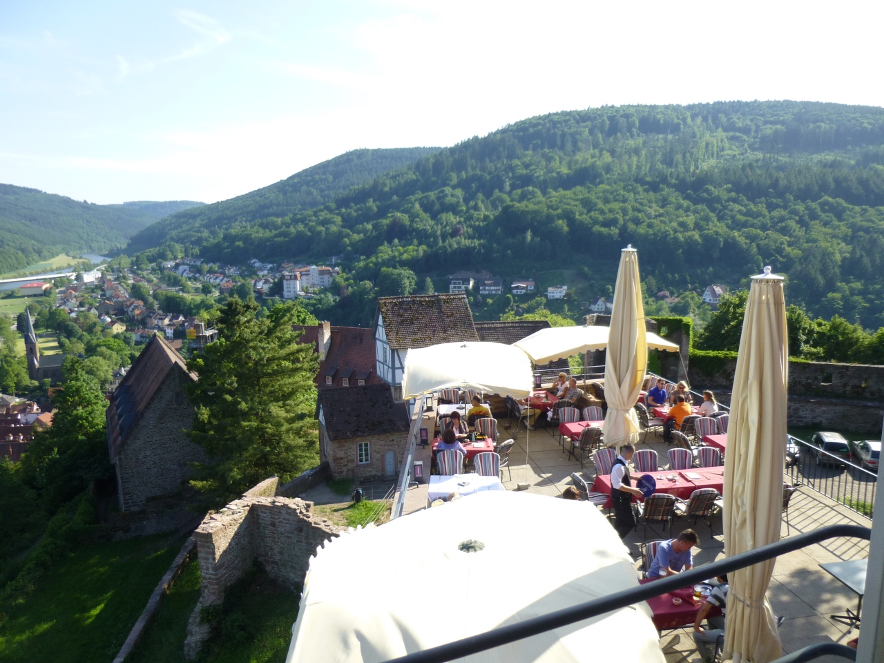 川沿いの道から、山道を登ると小さな城門がある。その門を入ると、古城ホテル ヒルシュホルン(鹿の角)城がある。快晴の日は眺めの良いテラスレストランから、ネッカー川を運行する貨物船や観光船、カヌー遊びの人も見える。その絵になる景観から、今では古城街道沿いの古城の中でも、人気の高い古城ホテルとなっている。