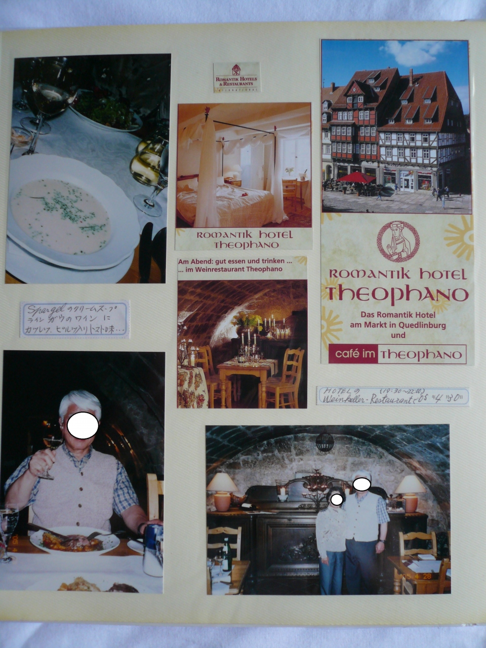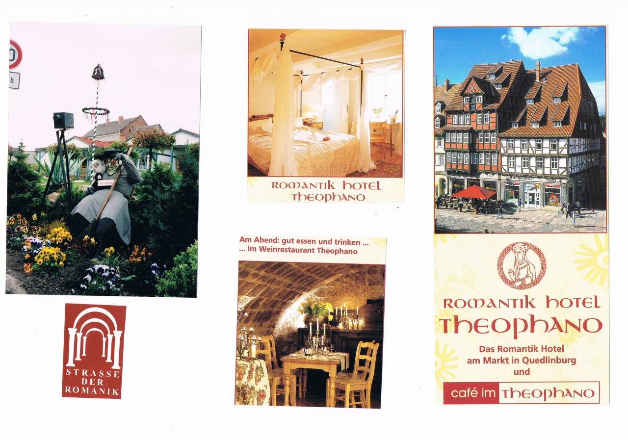 ロマンチックホテル・テオファーノは17世紀中頃に富裕な商人によって、バロック様式の家が建てられた。その後、ギルド(商工業者の組合)の所有になるとか、紆余曲折があり、1991年現在の形のホテルに改修された。“テオファーノの名”はあまりドイツでは聞かない名前で、ビザンチン帝国の皇女で、ザクセン王オットー二世に嫁いだ方の名から採ったそうである。王妃は王の死後、治世に賢女振りを示し、王国を維持、発展させたという縁起の良い名前だ。マルクト広場に面して、このホテルは一番の場所にあり、カラフルな木組みの家が目立つ。ホテルの一階はカフェと薬局になっていて、二階以上が22の客室です。エレベーターがないと案内に有ったので、荷物を運んでもらう。