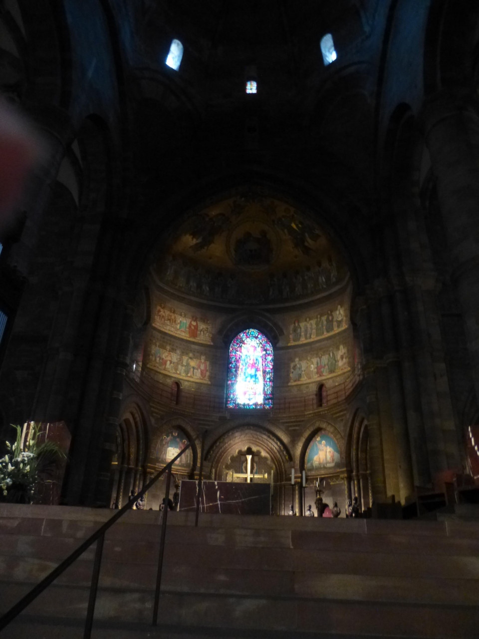 東の祭壇にはキリストの磔像(2008年)があり、西の奥のマリアの聖壇(後期ゴシック、1520年頃)は天使の柵(1200年ごろ)の横を上がると見ることができる。