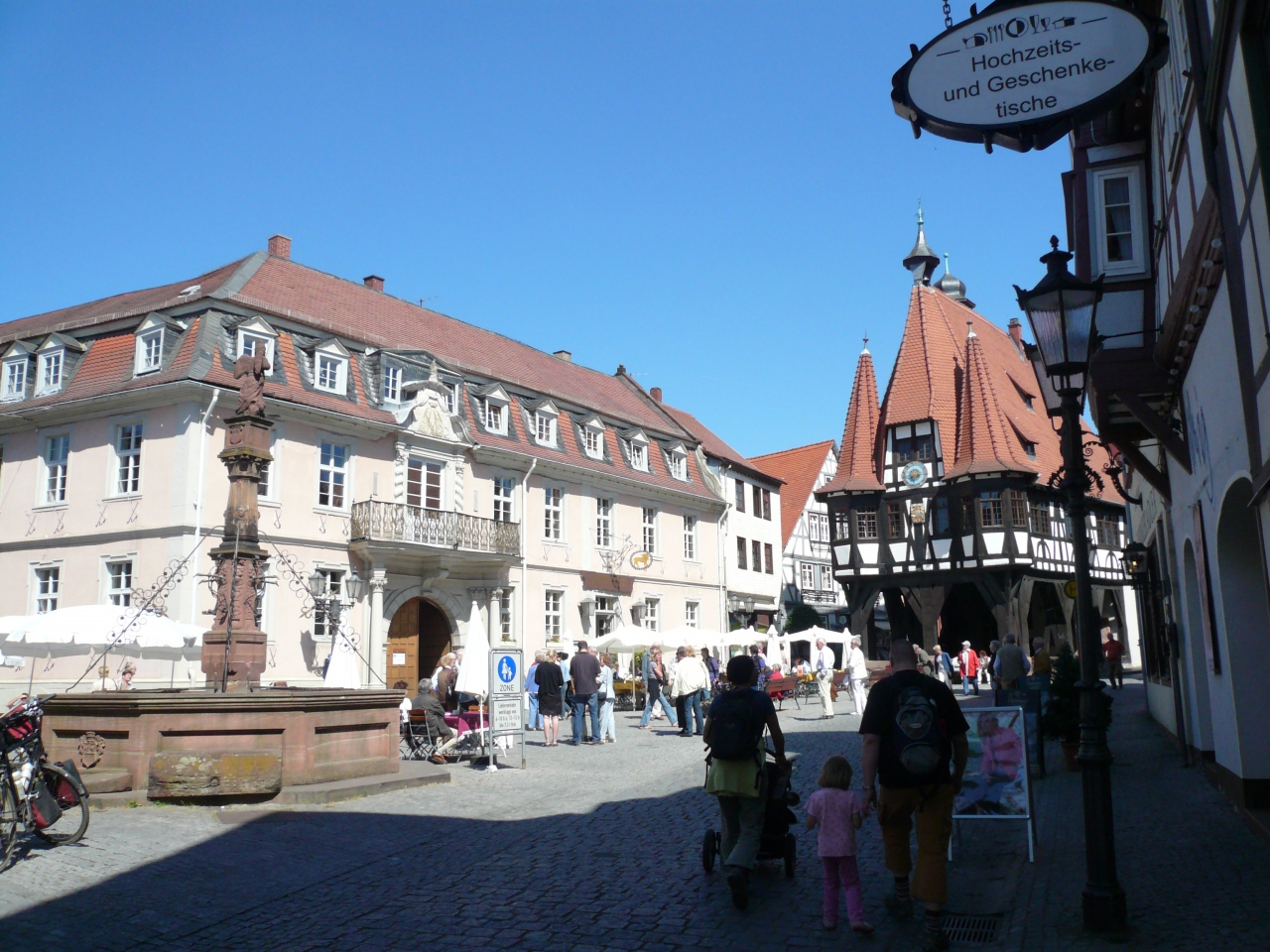 ここも色鮮やかな木組みの家々が立ち並び、ヴァルブルギスの前夜祭(29日)の今日は、家や店の前に魔女の人形が飾ってある。