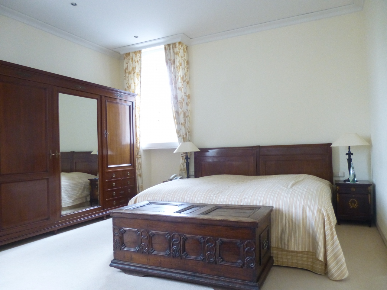 クラシックな色合いの良い部屋、大きなダブル、浴室は2泊したレッタースホーフ城より広く十分なもので、5星らしい時代物の家具、納戸風クロゼットには貸金庫、ミニ冷蔵庫もあり、急な雨用に傘もしっかり用意されている。