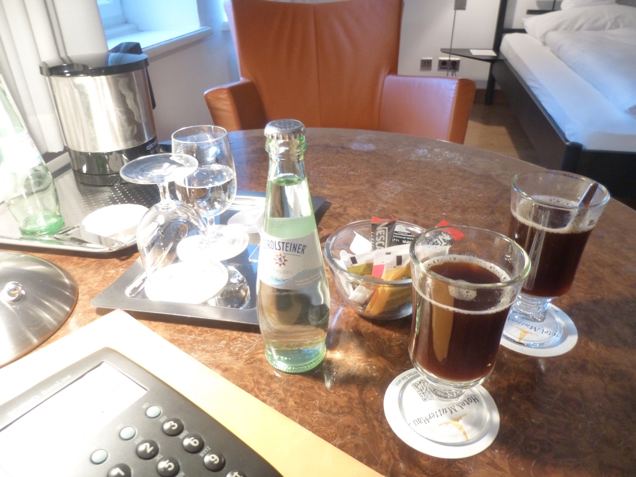 水(ガス入り)0.375L 2本、コーヒー、ココア、紅茶のサービスはあったが、浴用ガウン、スリッパは無い。古めかしい外観とは異なり、たいへんモダンなホテルである。