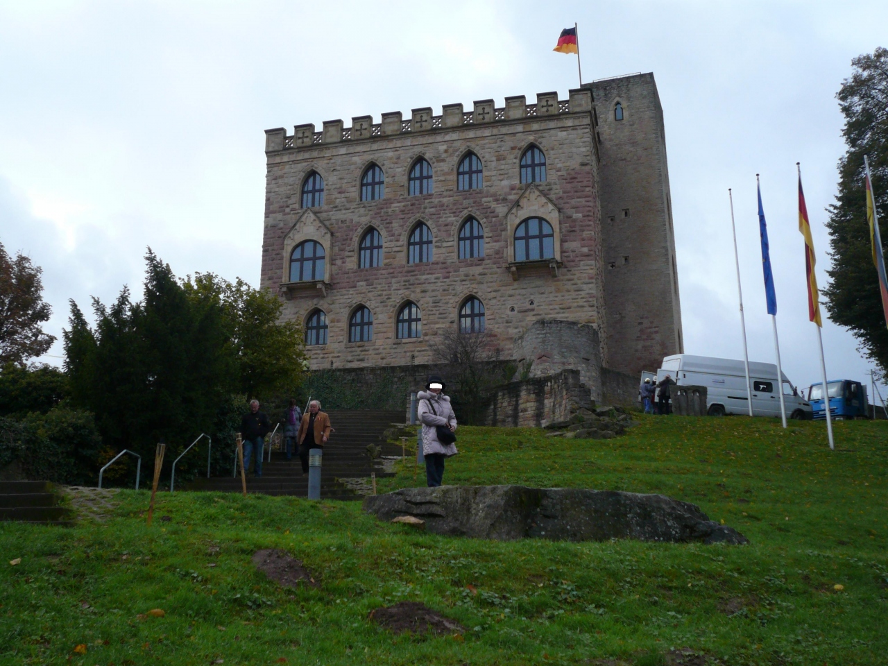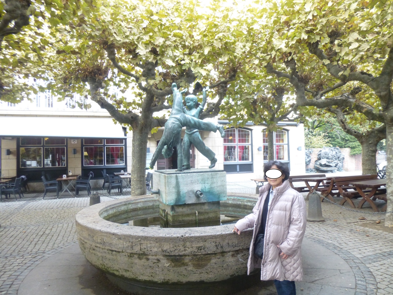 その先のBurgplatzブルグ広場にまたやって来た。来る度にRadschlagerbrunnenラートシュレーガーブルネン側転の泉を撮る。1288年、ケルン大司教の軍に対し、ベルグのアドルフ伯に従う市民達の軍がWorringenヴォリンゲンの戦いに勝利し、市民は都市の自治権を獲得する。この勝利を祝って、凱旋する兵を子供たちが“側転”をして出迎えたと言う故事に因んだもので、黄色くなったプラタナスの樹の下に“側転”像と噴水がある。