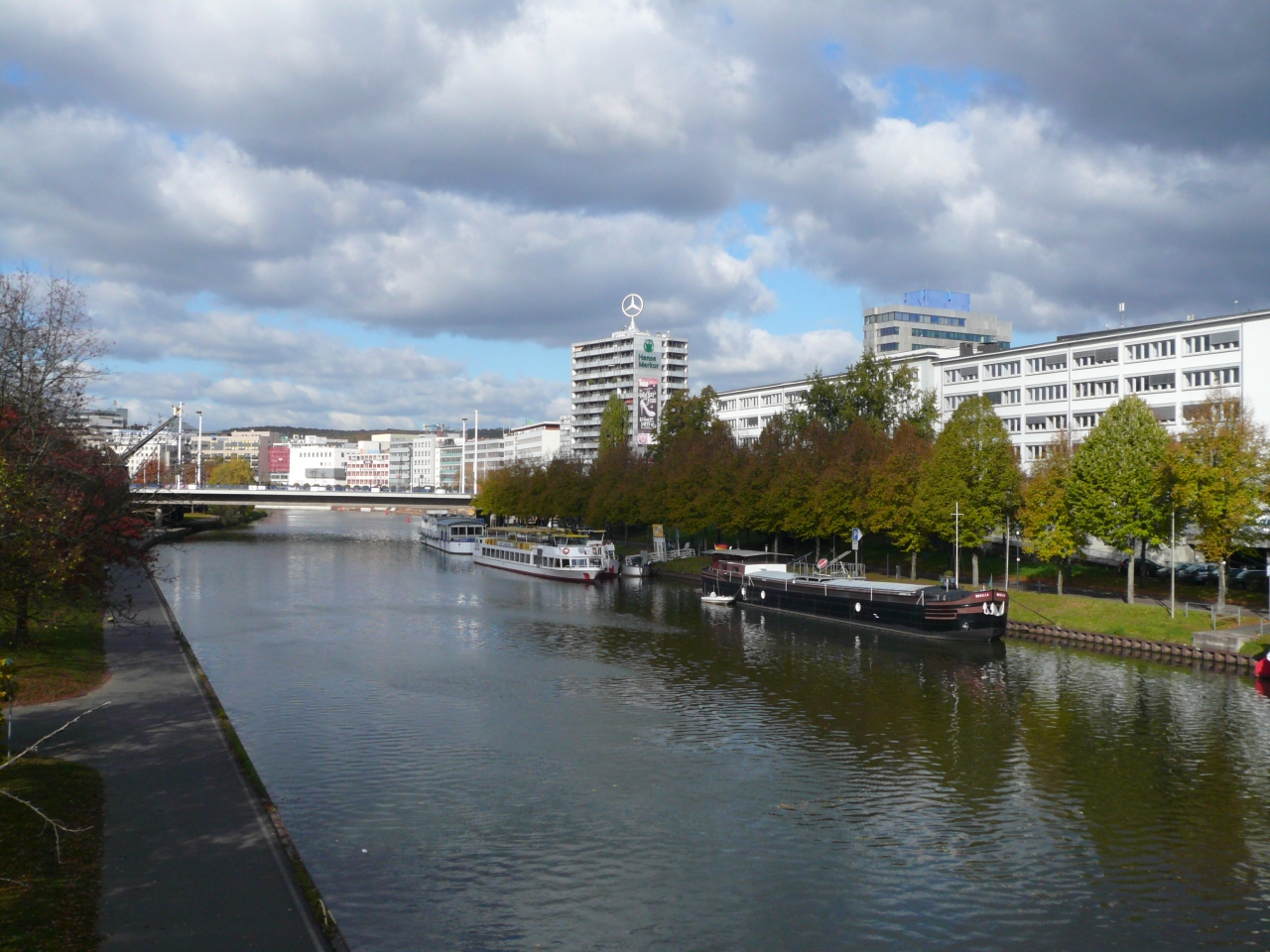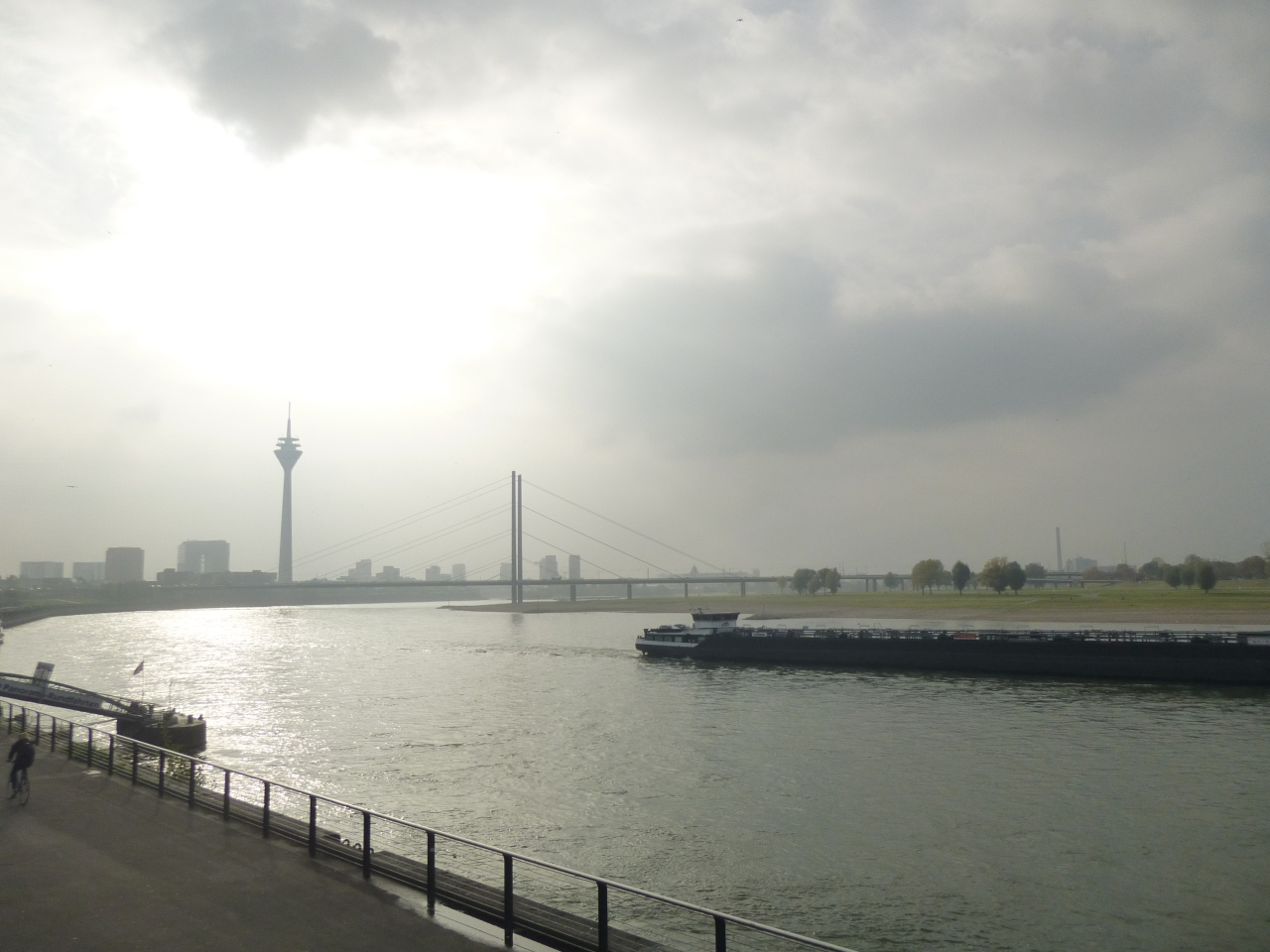 ラインには左からRheinkniebrueckeラインクニー橋、Oberkasseler Brueckeオーバーカッセラー橋、TH-Heuss Brueckeテオドーア・ホイス(初代西ドイツ大統領の名)橋と、三つの大きな橋が掛かる。その橋の下を相変わらず遊覧船や大きな、長い輸送船が河口に向けて、或いは上流に向けて、航行している。
