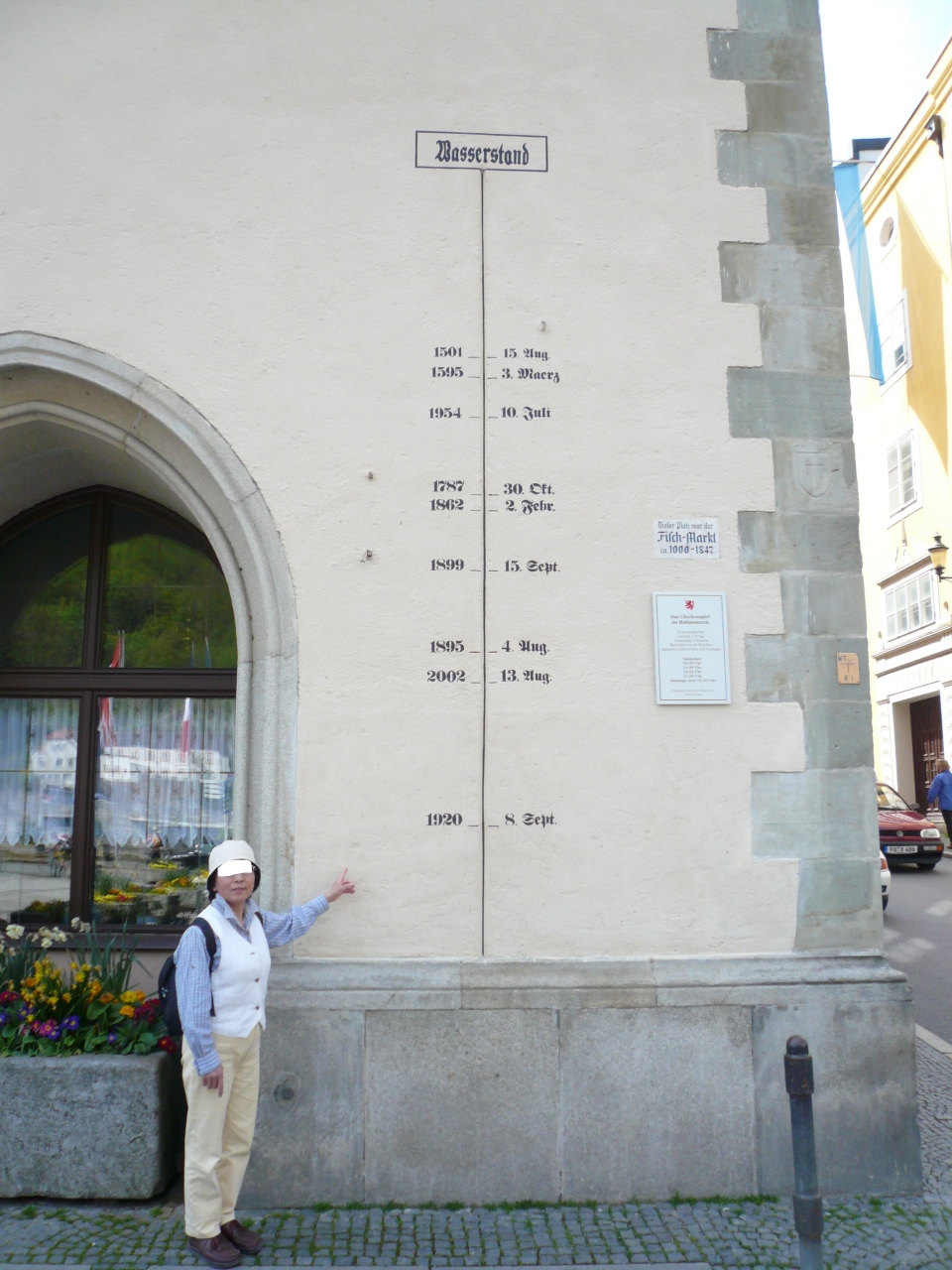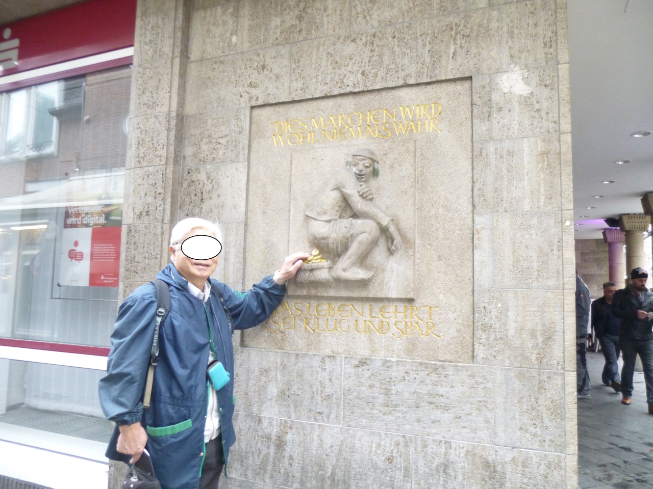旧市街名物の“金貨をひり出す男”の像が銀行の店の壁に彫られています。縁起物ということで、しっかり金貨?!を手で触って、運が付くように祈り、写真を撮った。