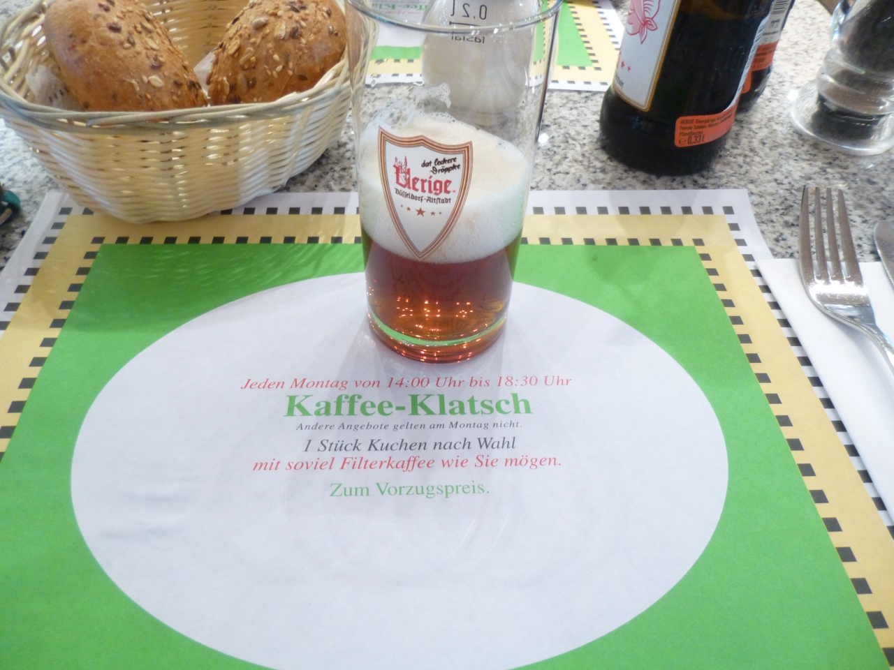 角を曲ると、地ビール・アルトビールのレストランUerigeウエリゲ(ビール醸造所:シュレッサーアルト、シューマッハアルト、ウエリゲアルト、フランケンハイムアルトの一つ)、魚料理のレストラン(Fischhausフィッシュハウス)などが続く。まだまだ閑散としているが、それでも店前に設けられた席で一杯やっている人もいる。このあたりは居酒屋やレストランが軒を連ねていて、「世界一長いカウンター」と称されているとか。
