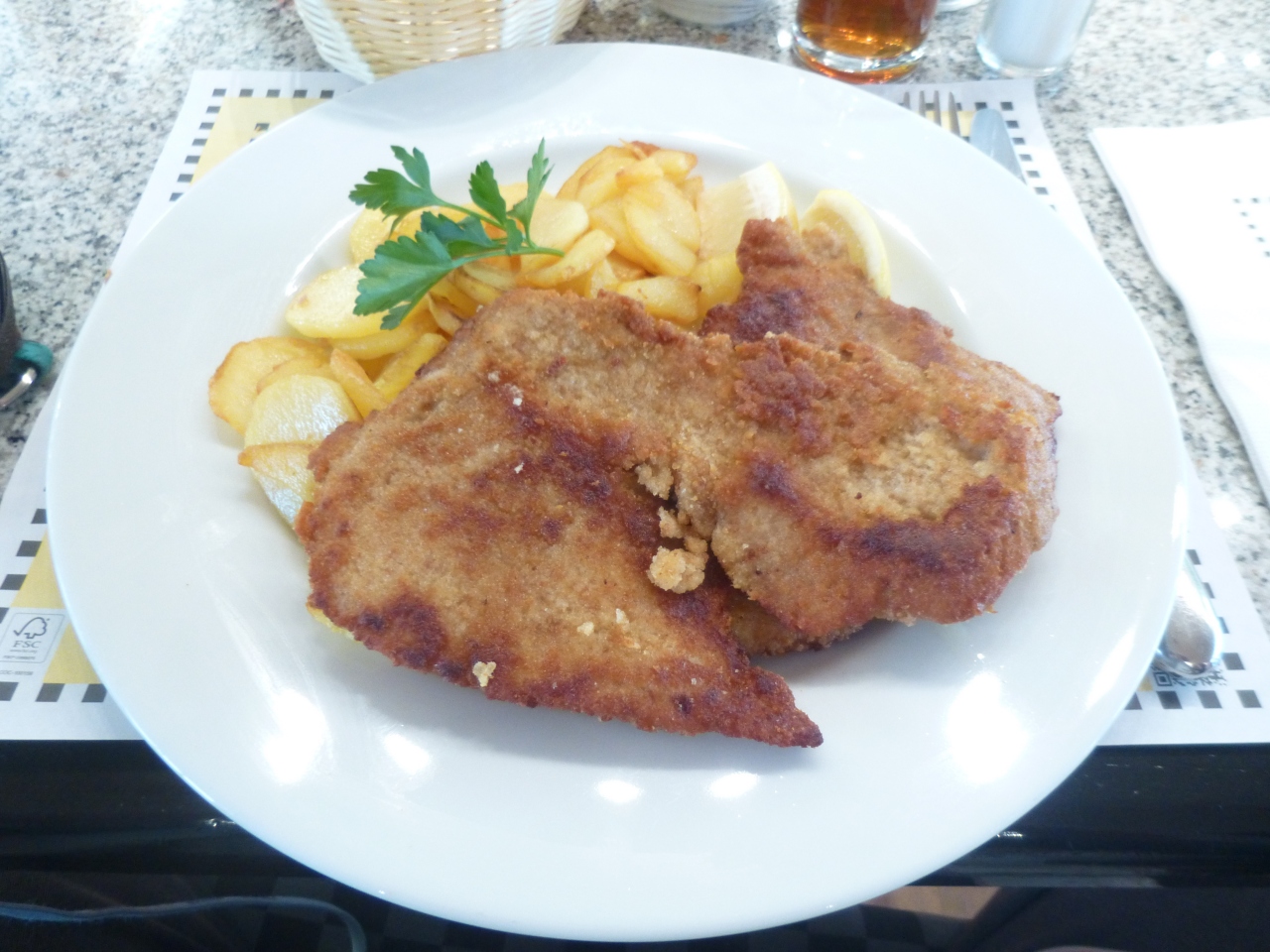 メインは家内がカレーソーセージEuro8.5、私がウィンナーシュニッツェルEuro11.5を注文しました。