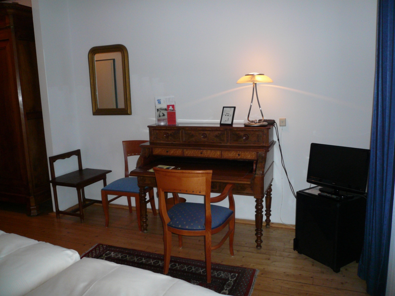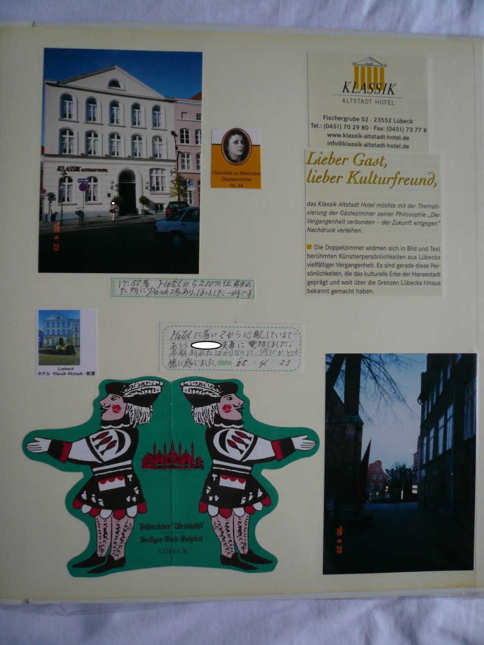 3階の部屋・No.56はFranziska zu Reventlowフランチスカ・ツー・レーヴェントロー*という女性作家の名が冠した部屋で、こぎれいなしゃれたものでした。このホテルはリューベックに関わりのある文化人達の名を各部屋に付けており、勿論トーマス・マンの部屋もあり、一番高い部屋だそうです。プチホテルだけに、食事は朝だけです。