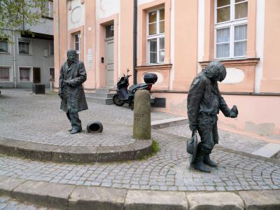 時計のある建物に仕立屋シュナイダーさんの銅像が鎮座し、通り過ぎる人たちは皆、体の各所を触っていく。髪の毛、眉、鼻、手や腕、膝の箇所が地の銅色に変わっている。