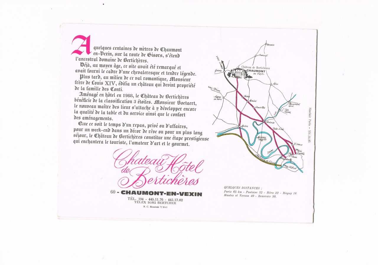 この時初めてフランス・パリの北西(車で50分)にある古城ホテル ベルティシェールChateau Hotel de Berticheres(F-60240 ‐Chaumont-En-Vexinショーモン アン ヴェキシン)に泊ったのでした。