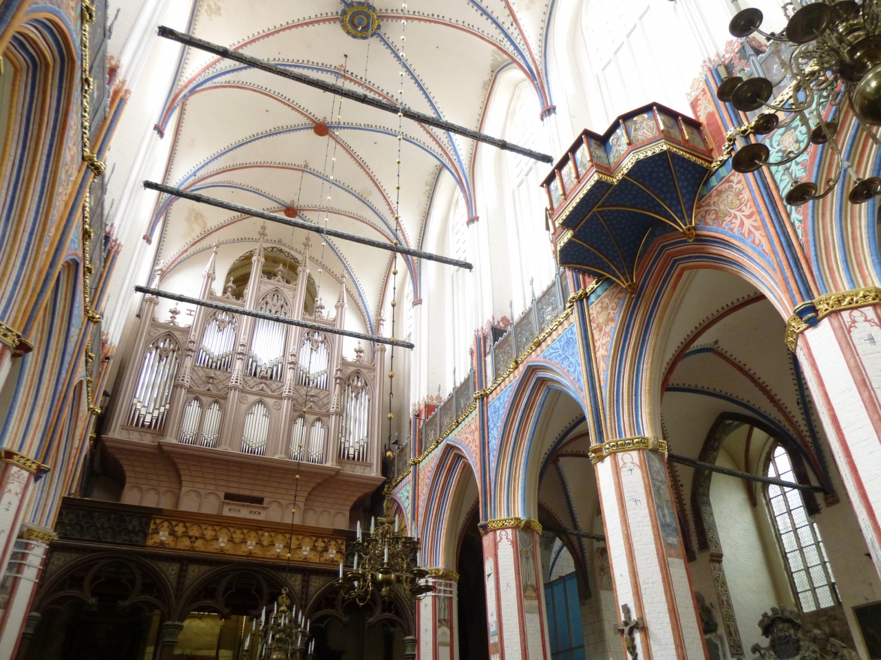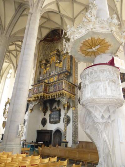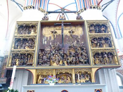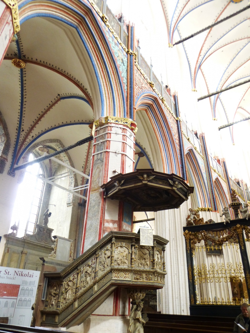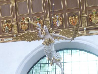 ニコライ教会のポータル、大聖壇(1480年製)、説教壇(1611年)、船底型の天井、教会の内壁を彩る美しい線とハンザ都市の紋章や聖人画、宗教画、パイプオルガン(1841年製)など、美しい色合いだったので、こちらはもう改装が終わっているらしい。