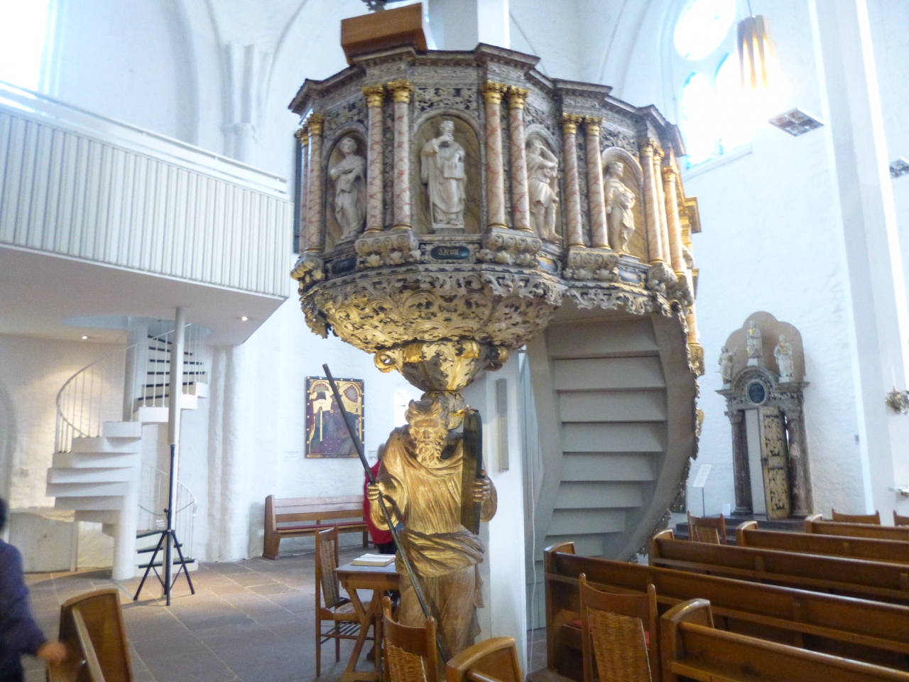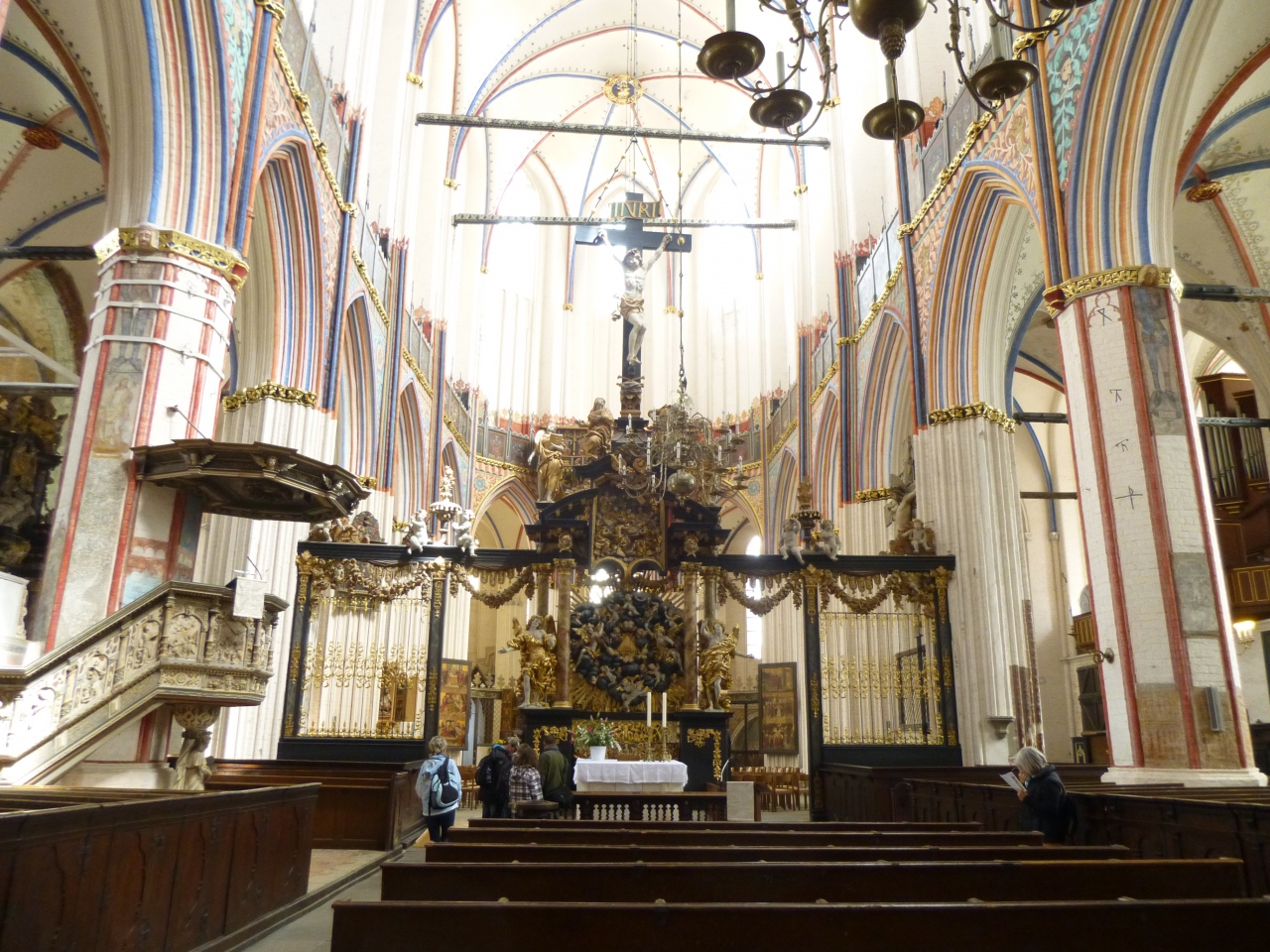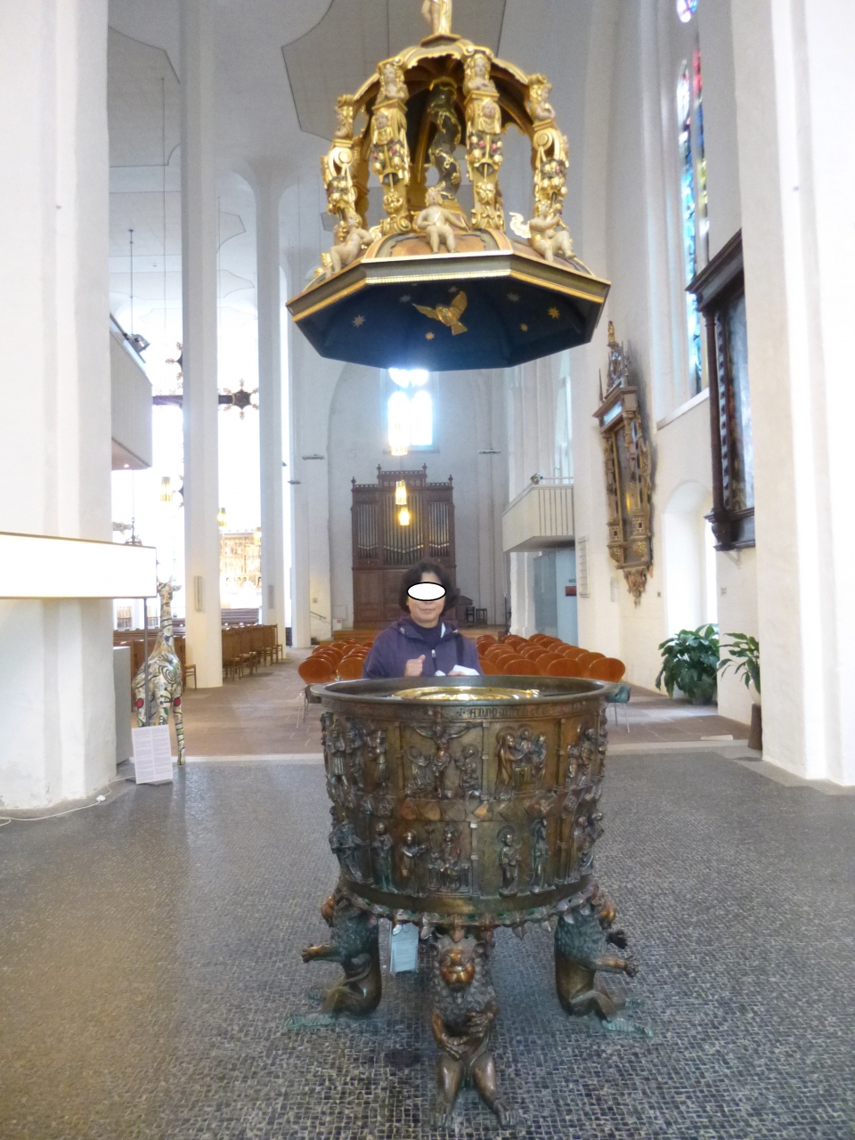 ニコライ教会のポータル、大聖壇(1480年製)、説教壇(1611年)、船底型の天井、教会の内壁を彩る美しい線とハンザ都市の紋章や聖人画、宗教画、パイプオルガン(1841年製)など、美しい色合いだったので、こちらはもう改装が終わっているらしい。
