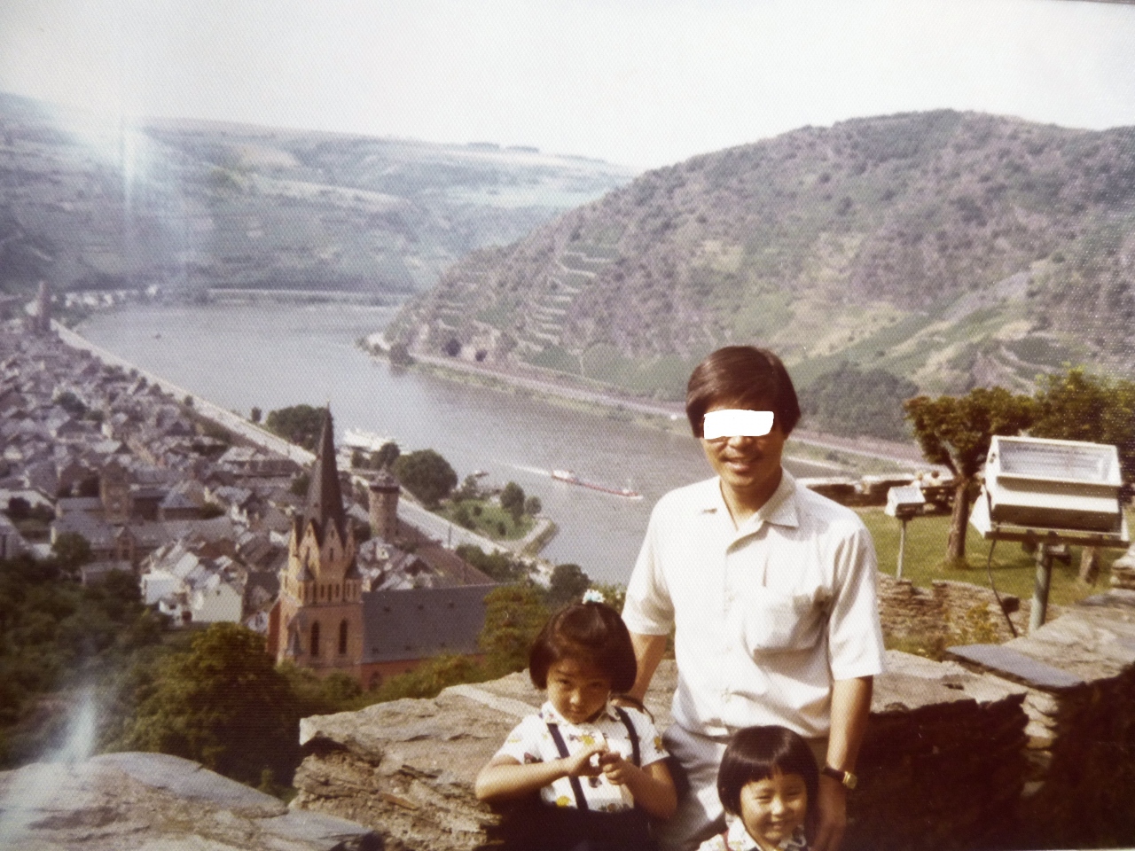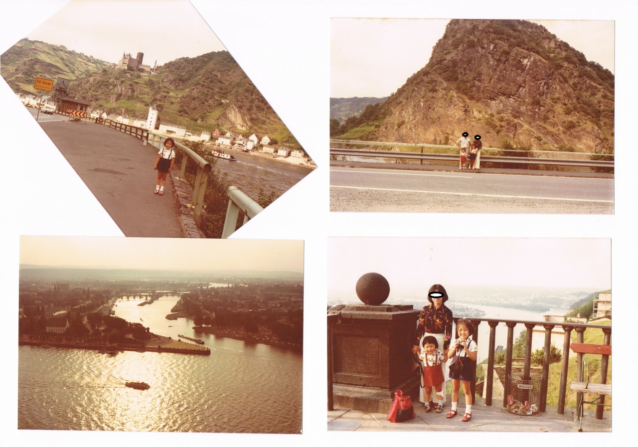 ホテルの庭から、ラインを見下ろす展望台に行き、鉄柵から、身をのり出して、ライン川の蛇行する流れや船の行き来を眺める。
