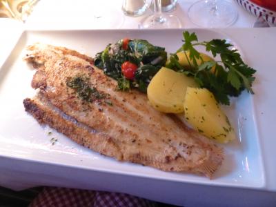 私が子羊の料理、インゲン・ジャガイモ添え。家内とSさん夫妻は舌平目料理。