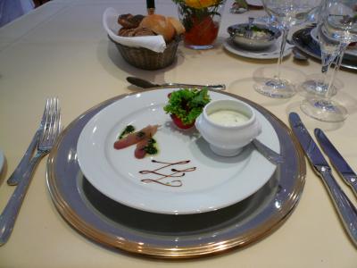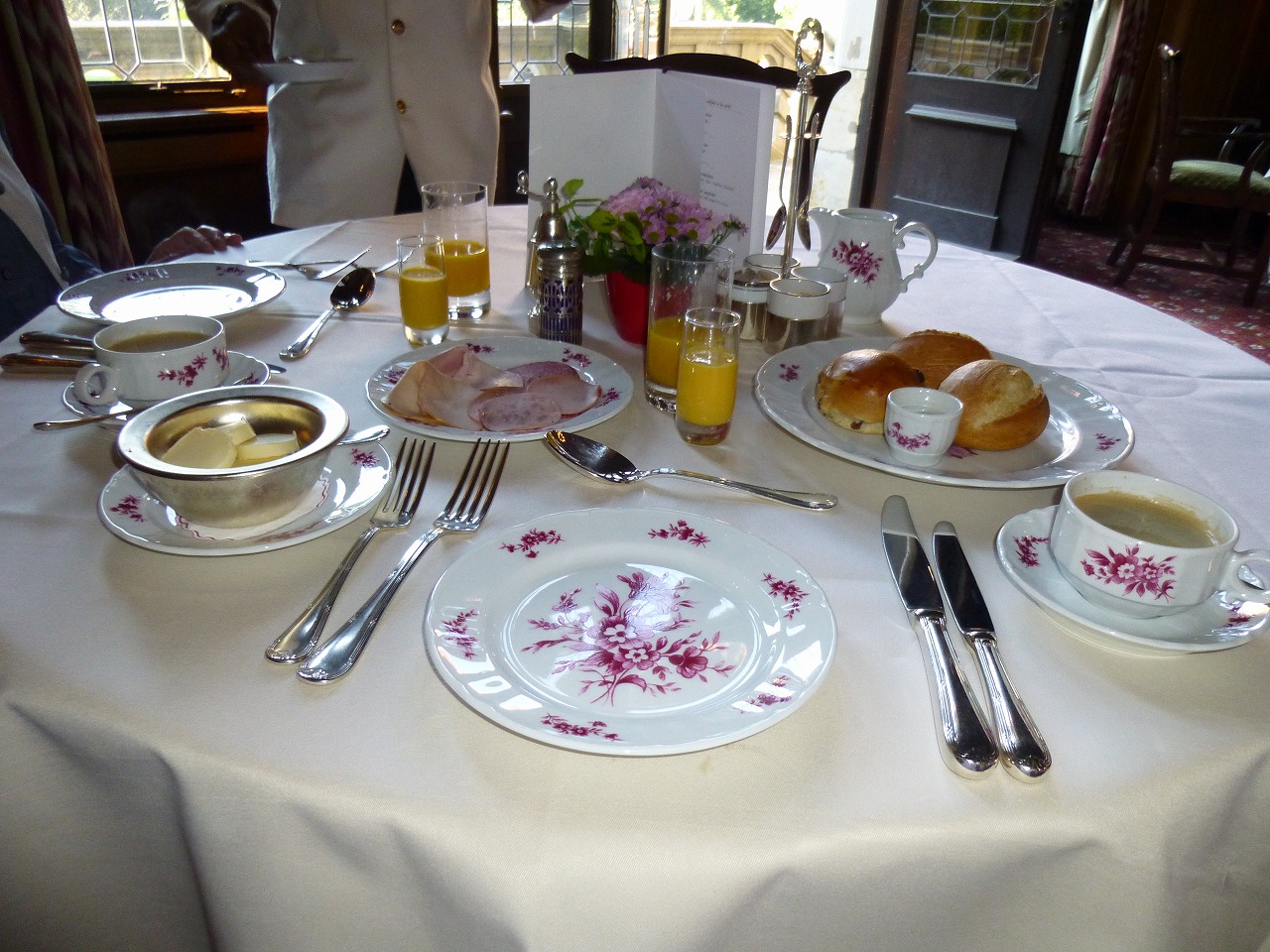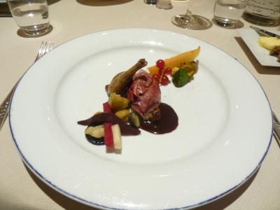 暖かな季節のなると、ゴルフコースに面して、日除けで覆われた広いテラスレストランがオープンする。この時の夕食はテラスで、朝食は中のシュロスレストランで食べました。