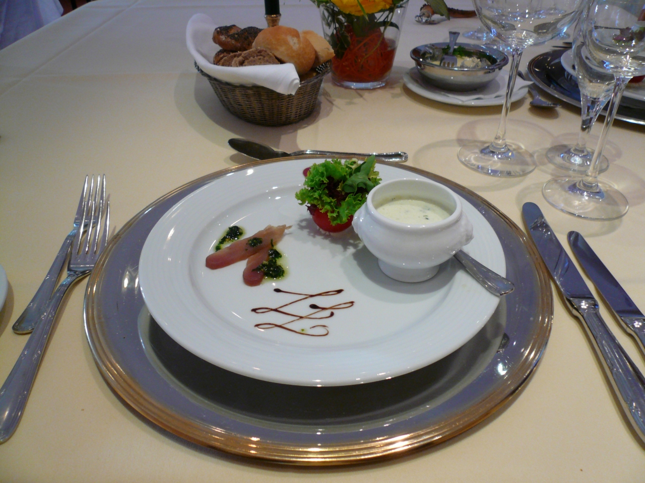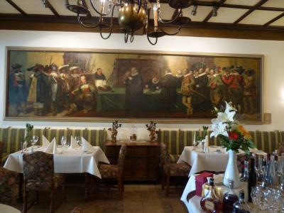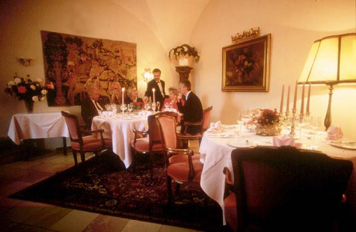 グルメレストランはSchlossrestaurantシュロスレストランと称し、フレンチ料理を主としている。時代がかった素晴しい室内は皇妃ヴィクトリアと皇帝フリードリヒ3世の肖像画だろう絵画が壁にかけられ、天井も高々とし、立派な暖炉を中心にした40席のレストランである。