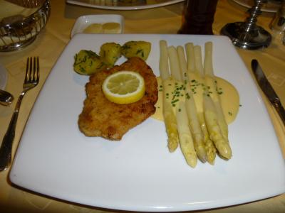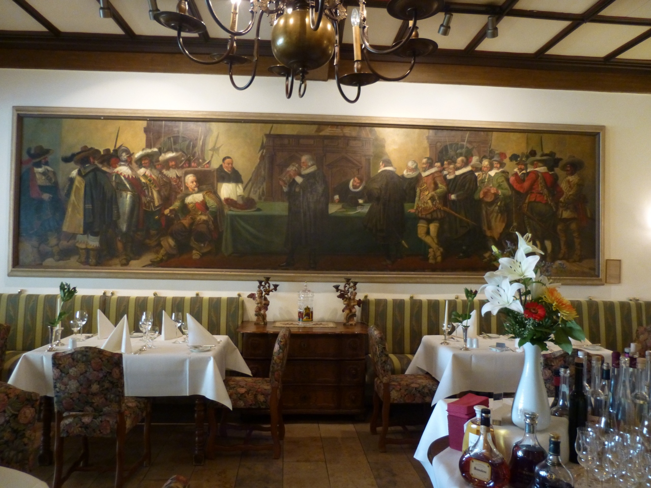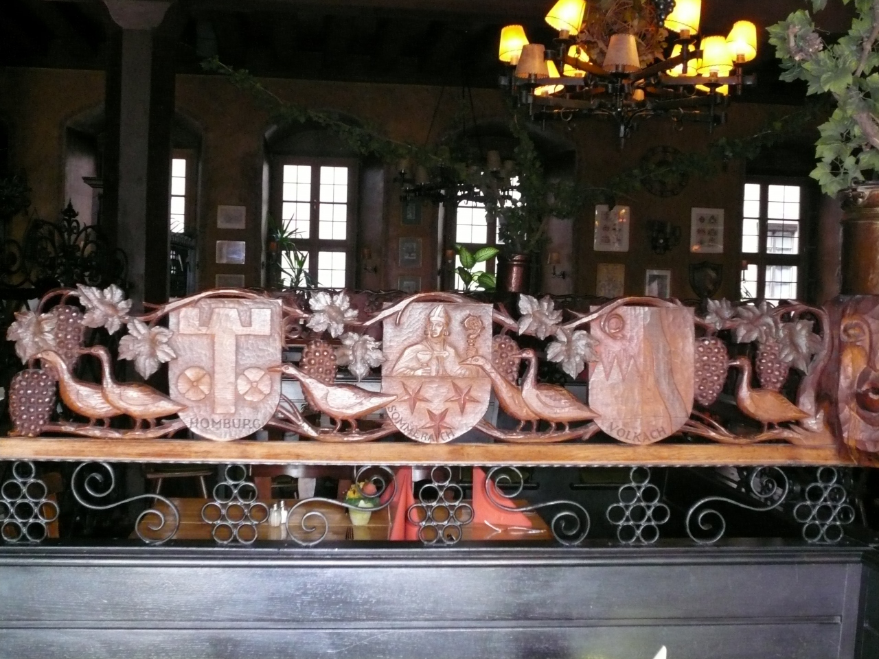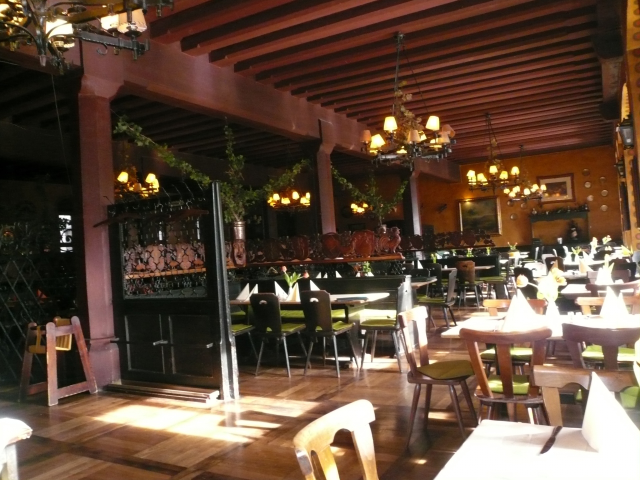 広いレストランは天井も高く、柱も太い。黄ばんだ壁にはこの町の名所を描いた絵画が架けられて、フランケンワインの独特の瓶や、ワイン産地の様々な町の紋章を刻んだ木板が席を飾る。居酒屋風なだけに、ここにはテーブルクロスは無い。