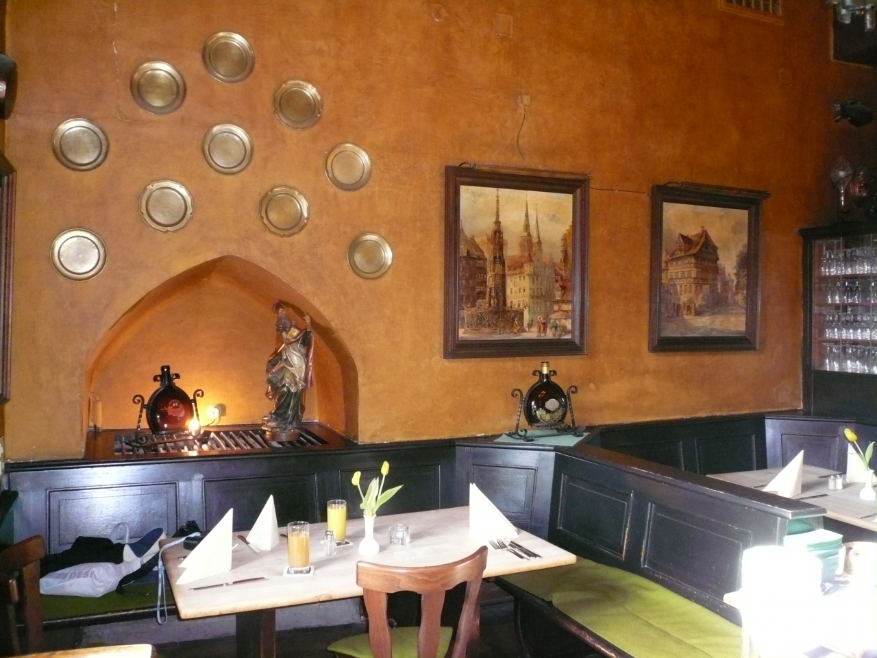 Nuernberger Rostbratwuersteローストブラートヴルスト焼きソーセージの最も知られた有名店は聖セバルドゥス教会傍のBratwursthaesleブラートヴルストホイスレだが、期待して行ったら、何と日曜日は休日で、傍系のレストランを紹介していた。