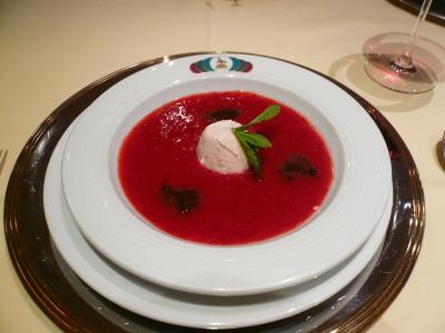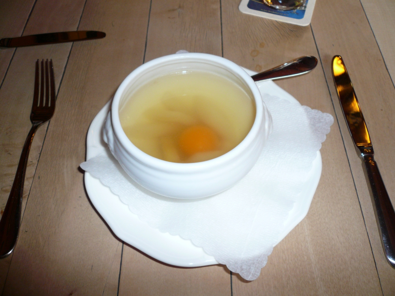 メニュー:シュパーゲルのコンソメスープ、真中に真っ黄色の卵入り。