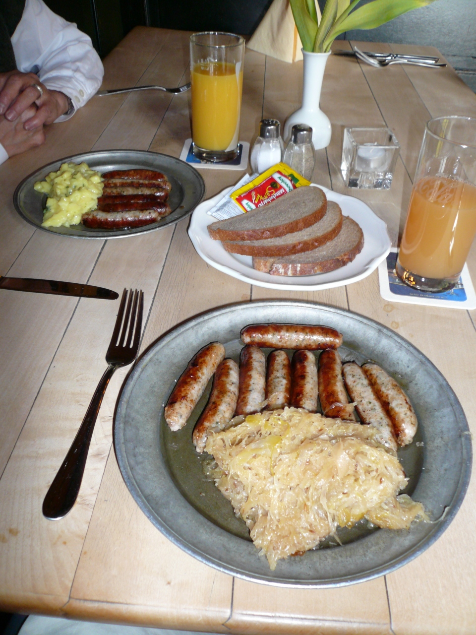 6本と9本のニュルンベルガー・ローストブラートヴルスト(焼きソーセージ)を注文。ジャガイモサラダとザワークラウト、ちょっぴり酸っぱいパン付き。