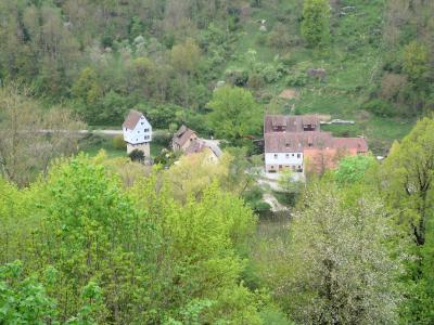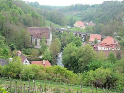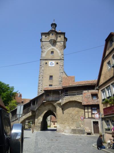 タウバー川の清流にかかる、Doppelbruecke二重橋(14世紀)や教会、村落がたいへん絵になる形で、こうしてまわって来た甲斐があった。美しい庭園・教会がある場所からは、城塞都市の違った風景も見え、Topplerschlosschenトップラー別荘(1388年実力者トップラー市長の別邸)と称される奇妙な建物も、公園テラスから見下ろせた。