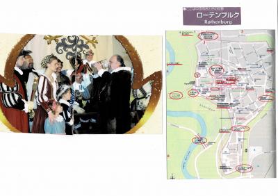 ざっとローテンブルグの観光案内をすると、駐車場P5からクリンゲン門の市城壁をくぐって町中に入ると、Schrannenplatzシュランネン広場(市場)に出る。まっすぐ行けば、マルクト広場だ。“Meistertrunk見事な一気飲み”目当てに日本人ツアー客や様々な国の観光客が多い。東の市門のGalgentorガルゲン塔、Rathaus市庁舎(13世紀)、Ratstrinkstube市参事会館(仕掛け時計1910年・Meistertrunk見事な一気飲み)、高い鐘塔、Georgsbrunen聖ゲオルゲの泉などはマルクト広場周辺にある。