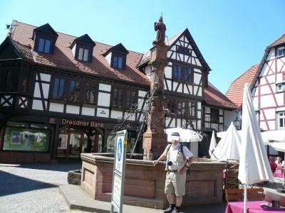 ここも色鮮やかな木組みの家々が立ち並び、ヴァルブルギスの前夜祭(29日)の今日は、家や店の前に魔女の人形が飾ってある。