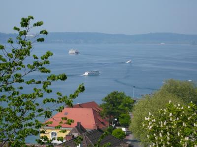本城館の4号室(2階)は新婚さん用Suiteです。ちょっとメルヘンチックというか、若い女性好みの部屋でした。広々とした部屋の中央に天蓋付きベッドが置かれ、白を基調にした室内、花柄のカーテン、張り出した角部屋は古城のテラスレストランに面していて、テラスの人々を見下ろすことになります。窓からはネッカー川を挟んで、ヒルシュホルンの町が見られる絶好の部屋でした。
