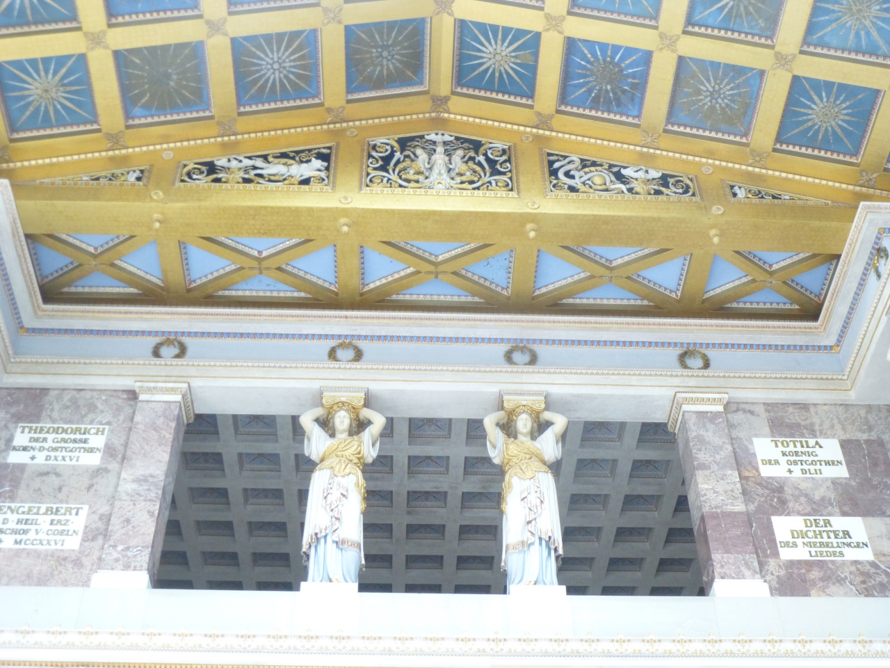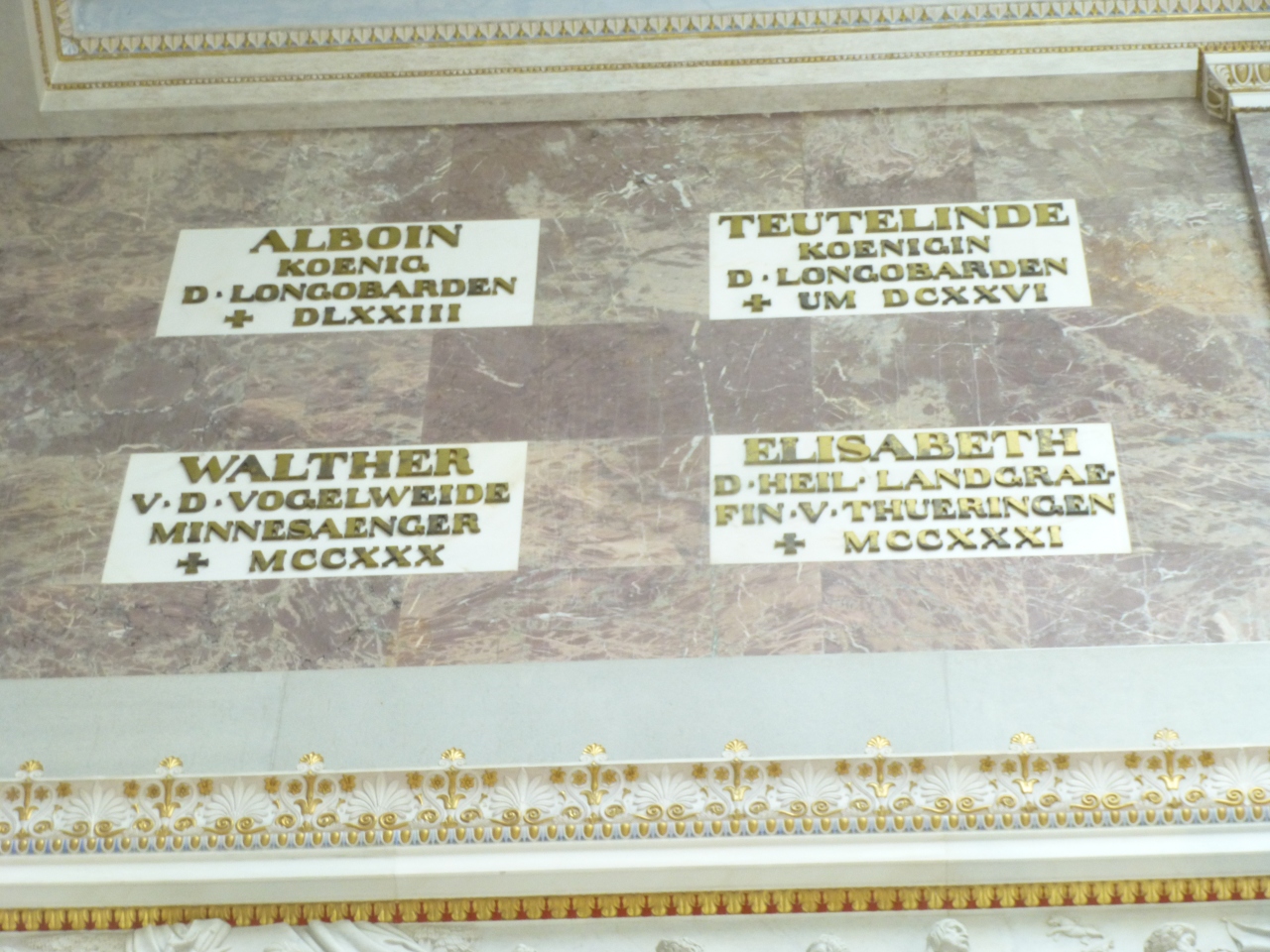 左右の壁にドイツ人(ドイツ語を話す)の 130 の胸像(例えば、ルター、ベートーヴェン、モーツァルト、デューラー、ホルバイン、フリードリヒ大王、マリア・テレジア、グーテンベルク、ゲーテやシラー、ハイネと世に知られた人物、それに王侯貴族、軍人・政治家、科学者たち、変わった人物では反ナチの白バラ抵抗運動Sophie Achollゾフィー・ショルが)があり、また、歴史を彩る、多くの聖人、英雄の 64 銘板(例えば、聖ボニファティウス、トイトブルク森の戦いに勝利したゲルマンの英雄アルミニウス(ヘルマン)、聖女エリザベート・テューリンゲン方伯妃、ナチス・ドイツに抵抗したドイツ人レジスタンス(1944年7月20日のヒトラー暗殺未遂事件に関与したシュタウフェンベルク大佐)などである。