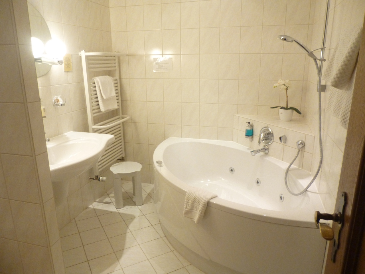 3星・全26室。4階の部屋はrustikales (素朴な)Doppelzimmer mit Whirlwanne(ジャクジーバス付)、Euro169X2=338(朝食込み:45,120円)。水、浴用ガウン無し。