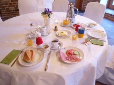 朝食はBarockturmバロック様式の塔の真下にあるKreuzgewoelbeクロイツ丸天井レストランにて頂く。塔内の上階にはHertefelder Suiteヘルテフェルト・スイートという豪華な部屋があるらしいが、この塔の後ろは壁だけが残るシュロスルイネ(城址)があり、古城ホテルの名はそこからとっている。