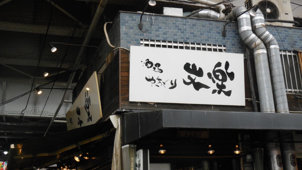 アメ横の、山手線高架下に、オープン屋台形式のテーブルがならぶ。奥に少しカウンター席あり。