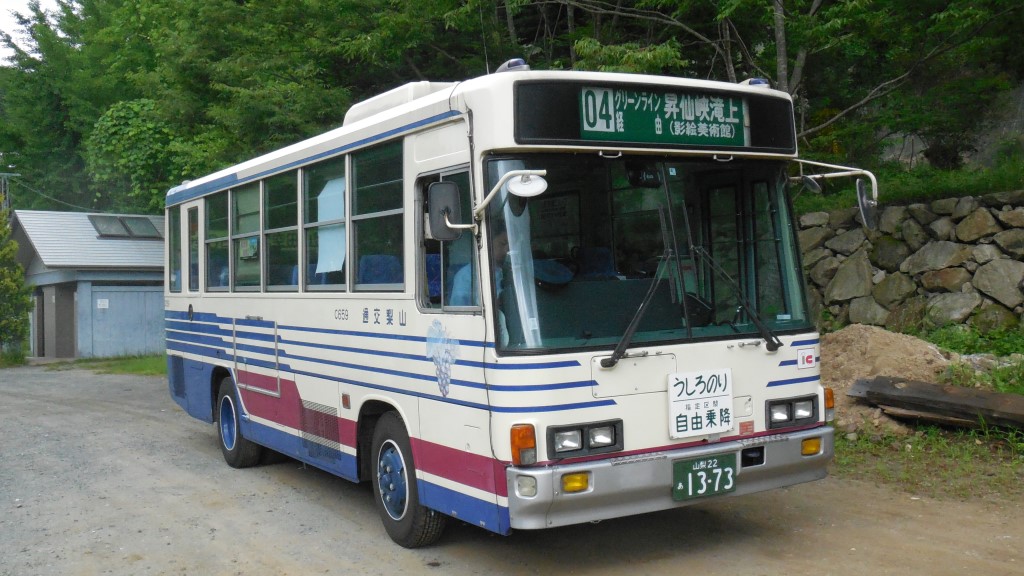 仙蛾滝の近くのバス停が終点だが、昇仙峡影絵の森美術館の駐車場内にバス停があり、やや分かりづらい(地元の土産物店の店員すらよく知らなかった)。昇仙峡を見に来る人は特にシーズンオフは自家用車で乗り付けることが多く、昇仙峡から乗車したのは私一人だけだった。ただし、湯村温泉を経由するので途中から結構乗車があり、そういう意味では生活感の濃い路線だった。