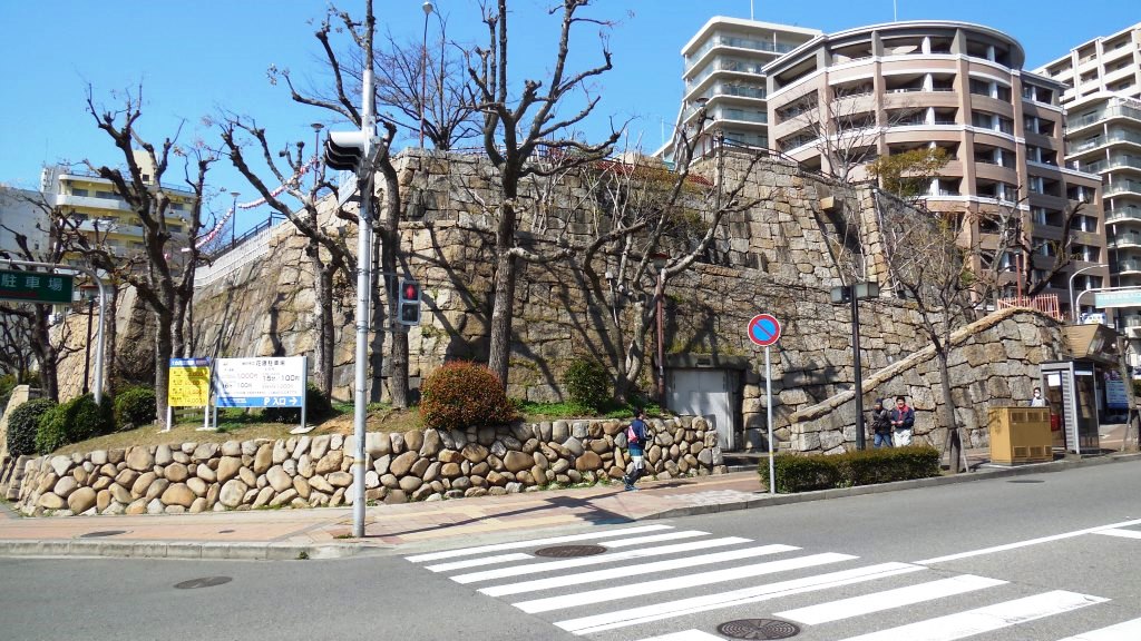 JR神戸線で元町駅に到着する直前に、山側に石垣の固まりが見える。これが花隈公園。もともとお城だったもの。