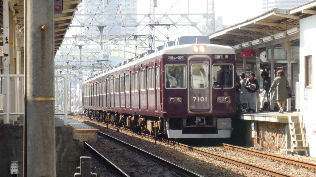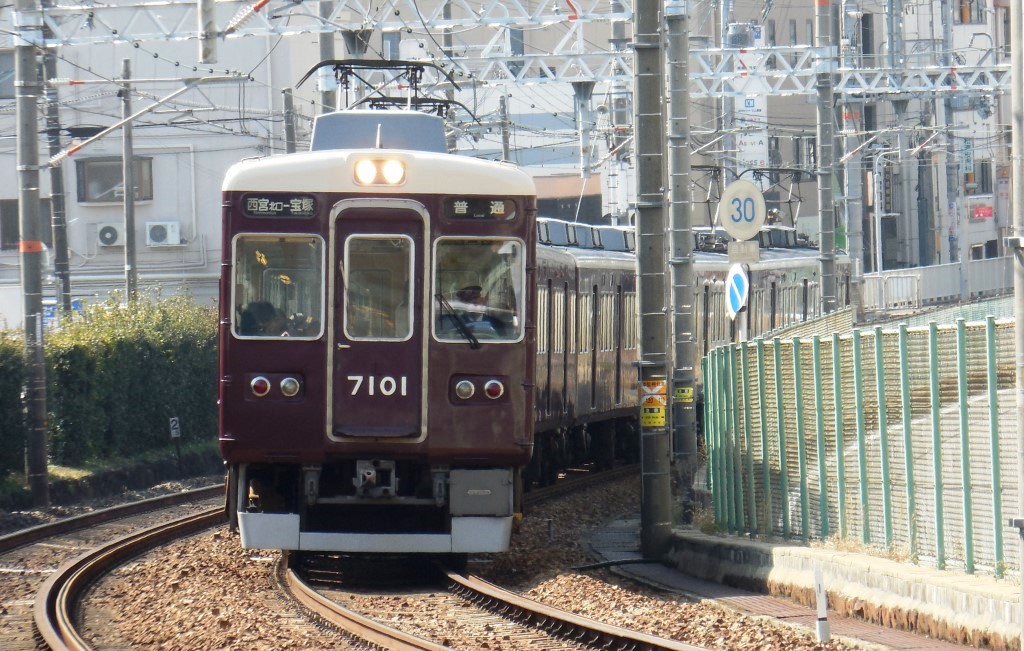 並走する阪急より速く、宝塚と大阪の間は快速だと30分かからない。3扉転換クロスシート車は、快速だけでなく、一部の普通にも使われている。