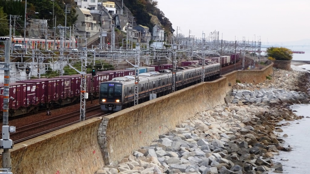 基本的に京都から西明石までの複々線区間は、いわゆる列車線を走行し、先行する高速コンテナ貨物をJR摩耶駅や茨木市など側線のある駅で退避させて追い抜いて行く。