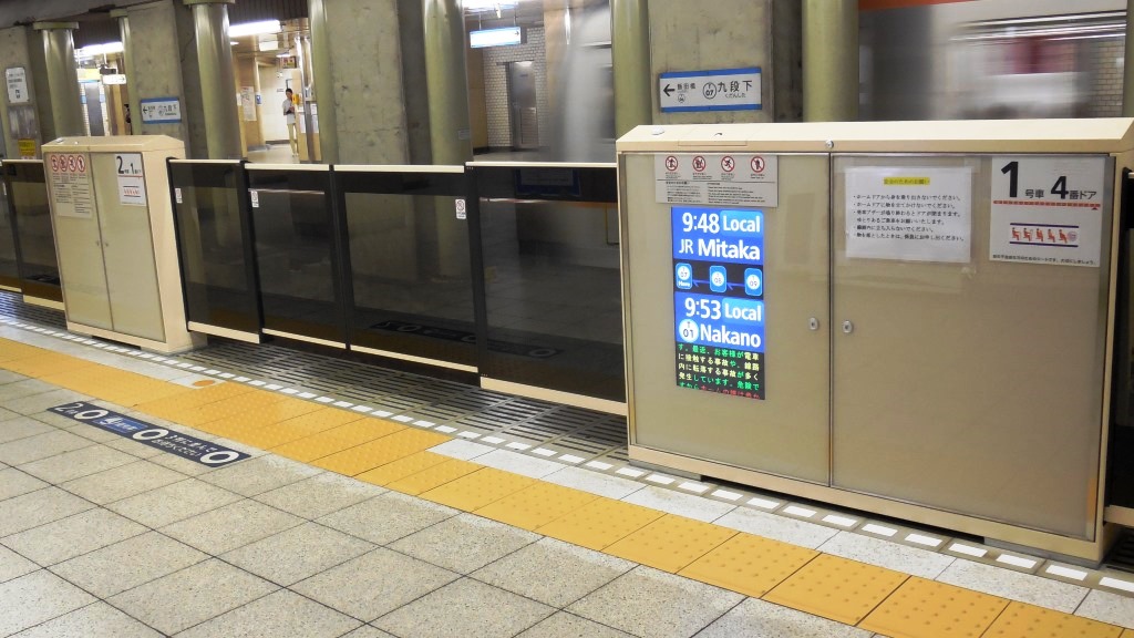 混雑の激しい地下鉄東西線、九段下駅でホームドアの試験を行っているのを発見。