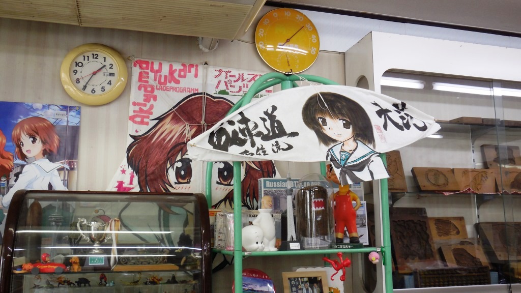 しかし、なんといってもこのお店、ガルパンの秋山殿を看板娘にしてから、様々なガルパングッズも販売している。手作りのグッズは人気が高く、すぐ売れてしまうらしい。
