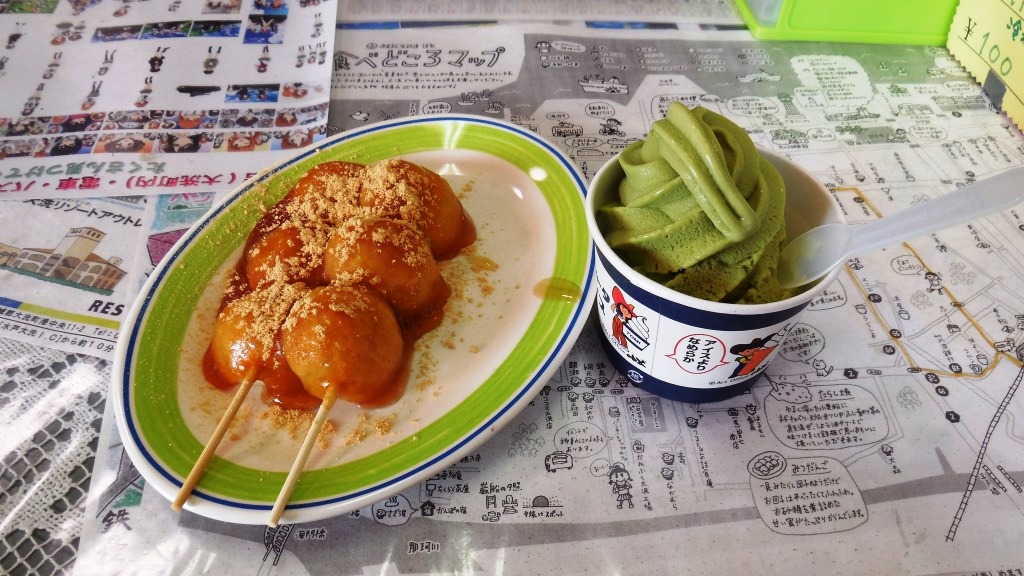 さくねんにひきつづき、ここで軽い昼食にした。今回も名物みつだんご、それと暑かったので、ソフトクリームも食べた。