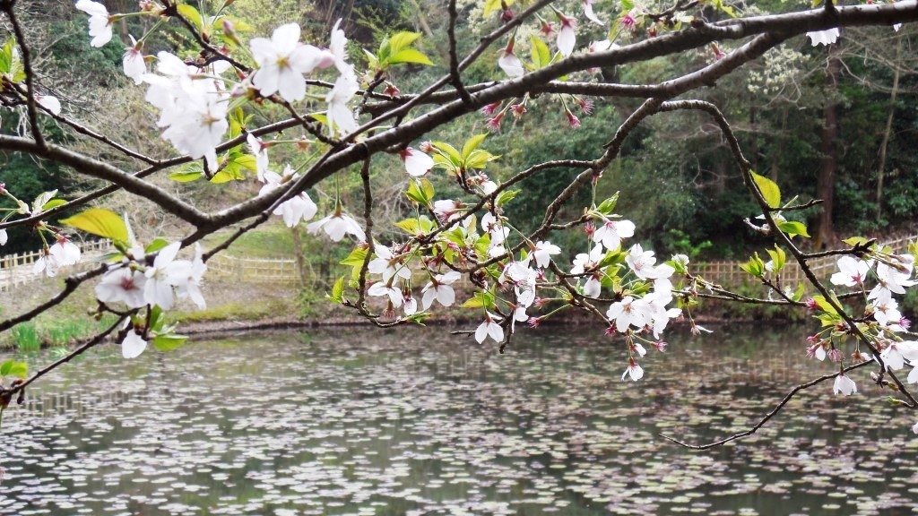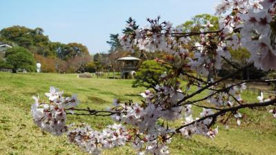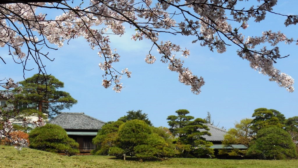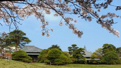 桜であるが、4月6日時点では、写真の通り満開だった。庭園には数本大きな桜の木がある程度で、桜そのものは、庭園の前にある厚生園の中のほうが、並木道になっていてはるかに見ごたえがある。