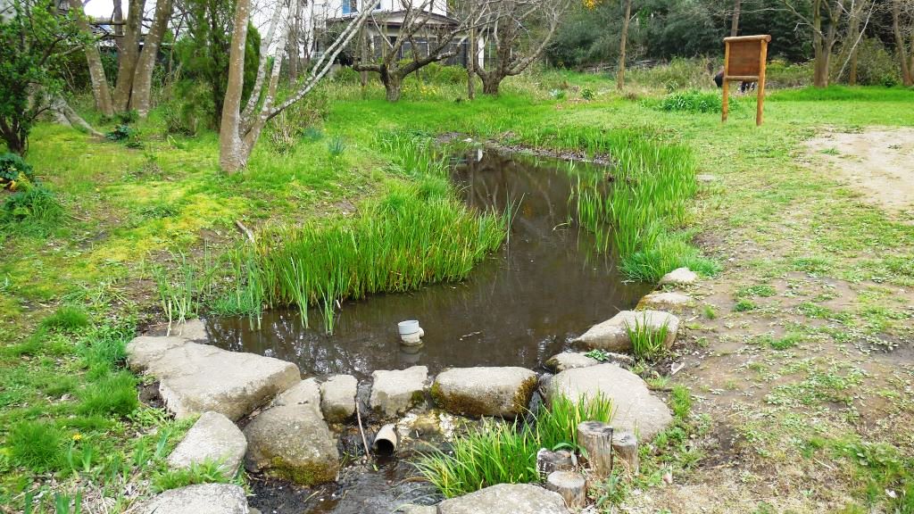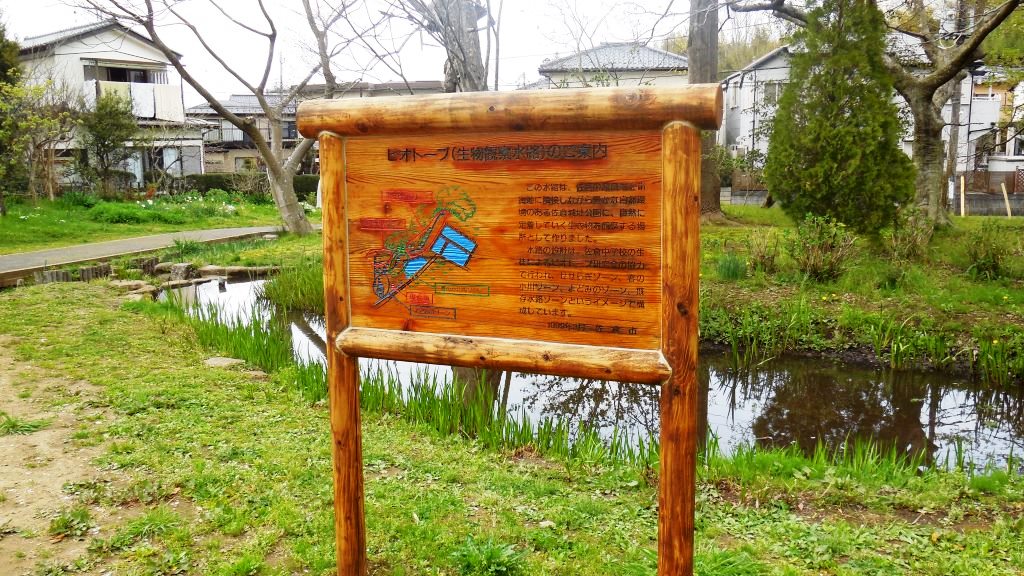 この菖蒲田のすみ、南側の斜面から東の出口(市役所の麓)にかけて、ビオトープが整備されている。地元中学生が中心になって整備保全したものであるが、湧き水をあつめ、小さな池に流し、清流をつくってクレッソンなどが生えている。