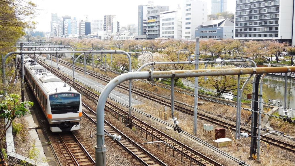 一年を通じて都心のオアシス。中央線は、飯田橋から市ヶ谷まで、江戸城の外堀後沿いを走るが、このお濠の周囲に桜が植えらえており、花見の時期は桜に染まる。