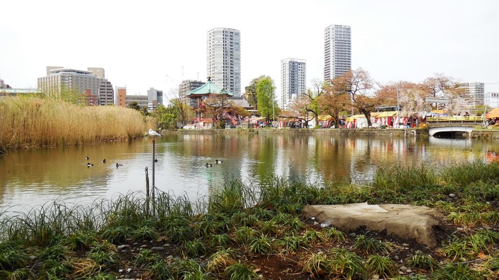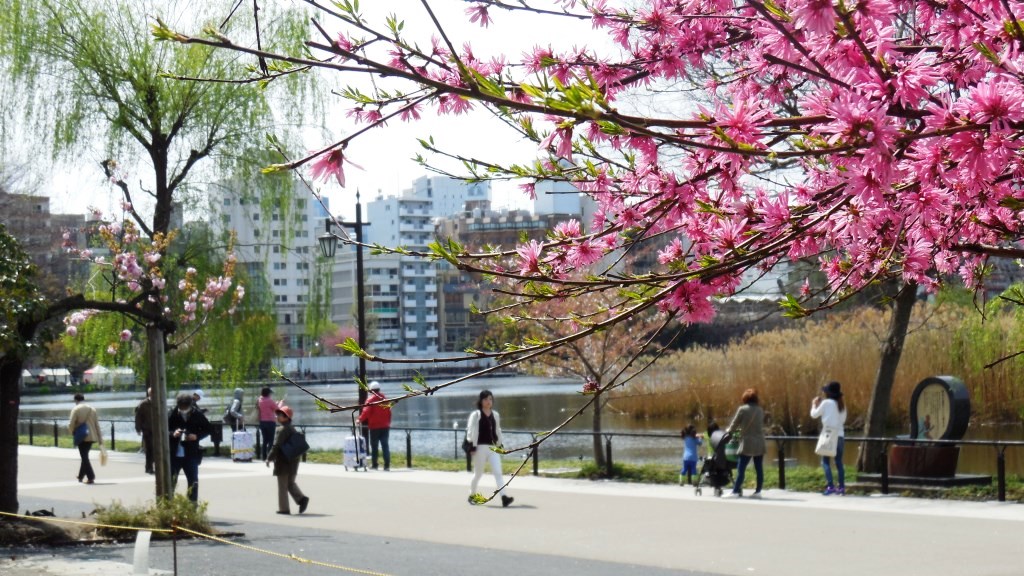 京成上野駅がいちばん近いためか、最近は外国人も多く訪れ、島の弁天堂は1年通して多くの人で賑わう。4月10日頃の桜などの花の様子は写真の通り。
