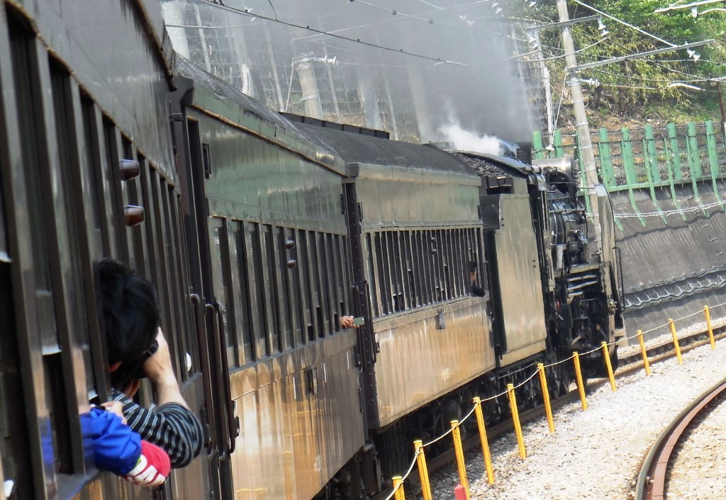 ここで運行してる蒸気機関車はC12型、C11型という、ローカル線用の小型機関車と、50系客車という、昭和50年代に北九州や山陰、東北、北陸に相当数投入された近代型客車だ。50系は、車内は電車とあまり変わらない内装であるが、窓が開きエアコンが無いので、SLの走行音がよく聞こえる。