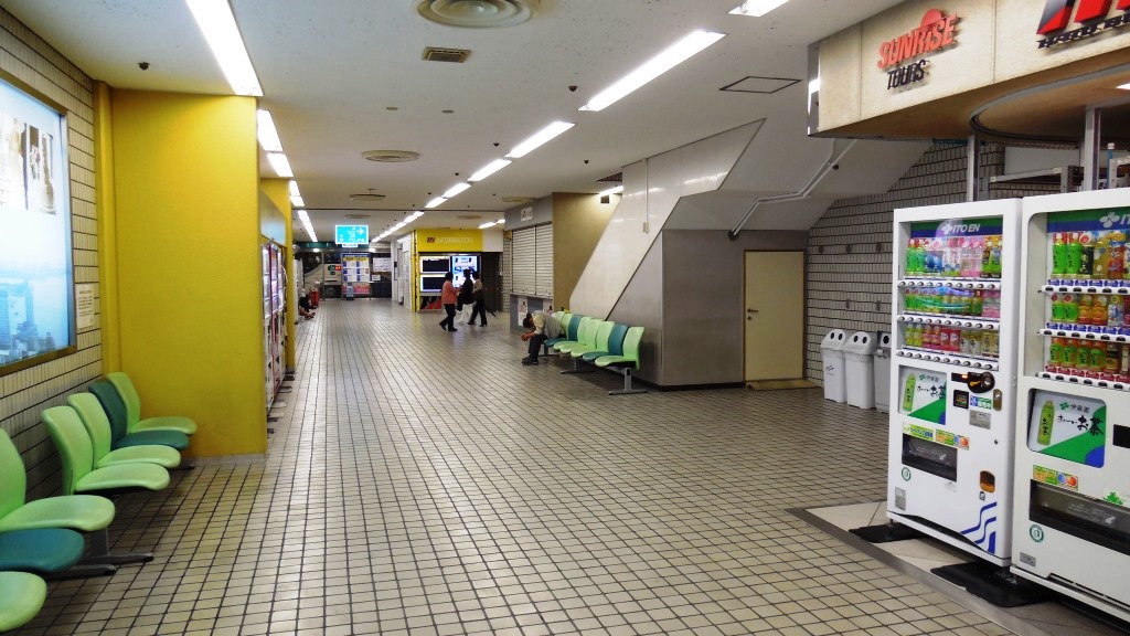 施設は待合所(2階。ベンチあり)、化粧室、そしてバス乗車券の券売機、飲み物自販機があり、係員も詰めている。まだ、知られていないのか、空いていた。